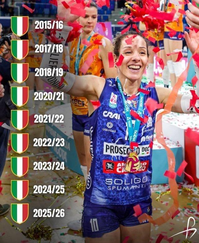 女排🎤意媒: 在科内利亚诺队赢得的全部9次意甲冠军中,始终有一个固定的身影,一种恒常的存在,这支球队的顶梁柱——她就是莫妮卡·德吉纳罗:最具标志性的自由人,一位完全超出常理的球员。她的荣誉簿没有尽头,赛季复赛季不断延长,注定将载入世界排球史册。