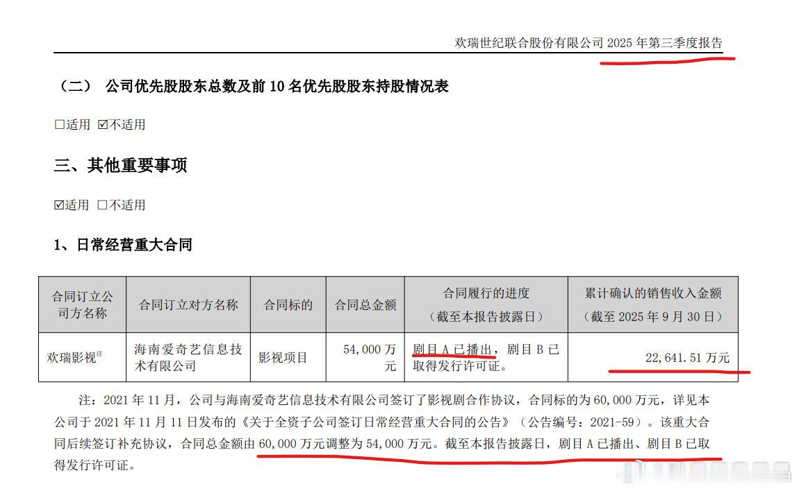 根据欢瑞世纪2025第三季度报告,项目A莲花楼累计确认收入为2.26亿元,还有1千四百万左右尾款没付。 爱奇艺是按照kpi结尾款的,这么久没付款了应该是不会付了。