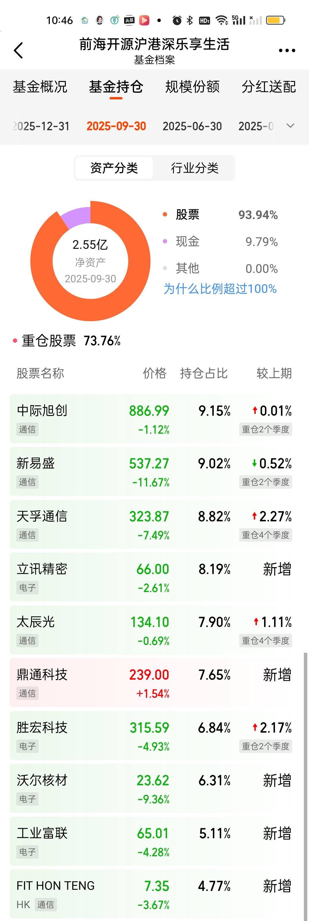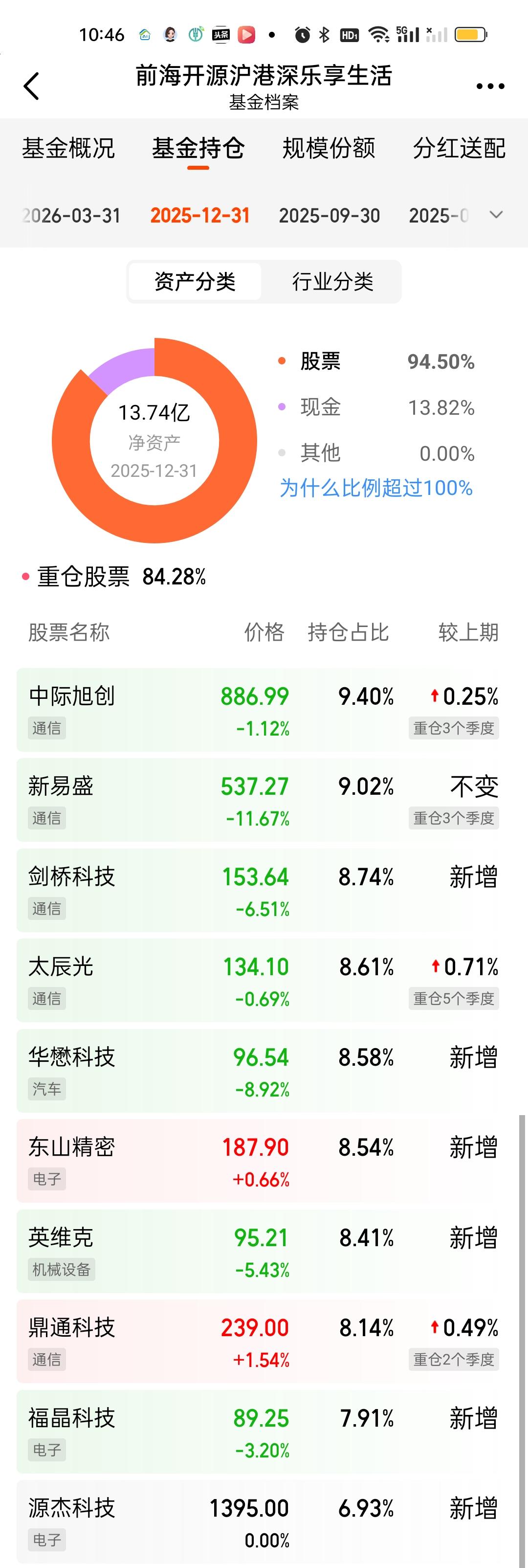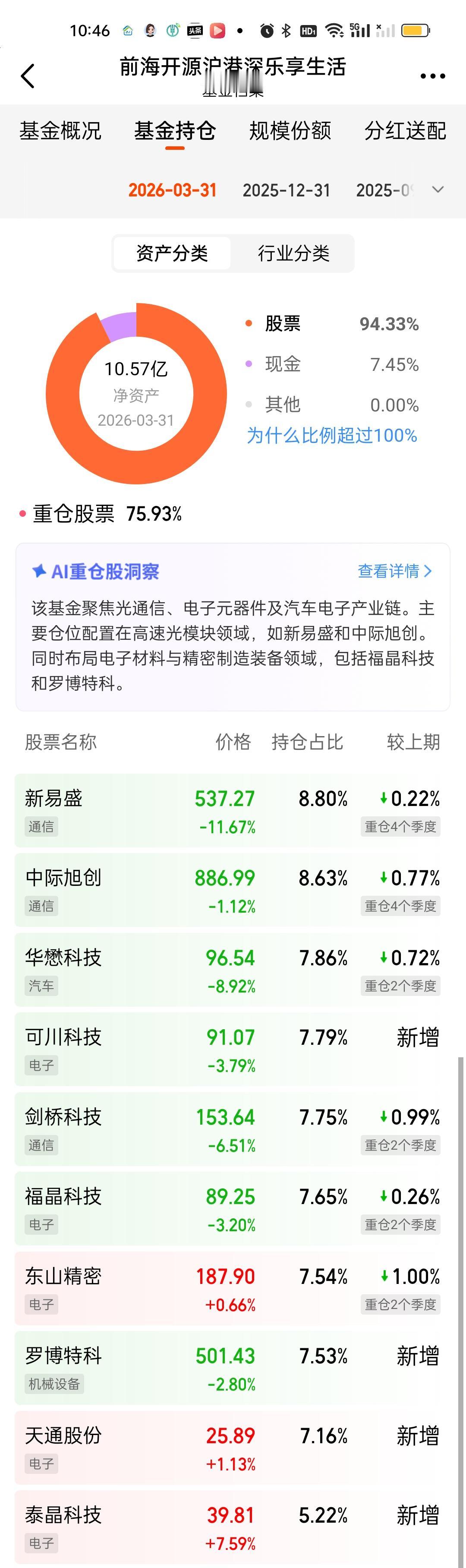 这次调仓前十大重仓股占比84.28%下降到了75.93%,新增了4只个股,可川科技,罗博特科,天通股份,泰晶科技,舍弃了太辰光,英维克,鼎通科技,源杰科技。把新易盛,中际,剑桥,东山的仓位都降低了一些。联想到英维克的暴雷,也算规避了一些风险。所以整体表现比那些硬抗的要强一些。