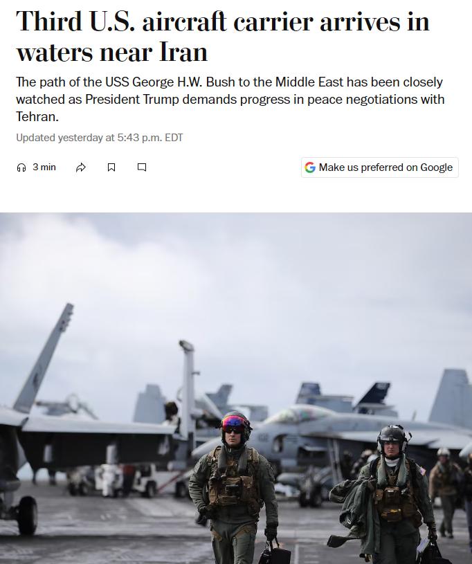 更让人警惕的是海军,4月23号那天,美军“布什”号航母正式进入美国中央司令部的责任范围,现在就驻扎在印度洋上,虎视眈眈盯着中东地区,这航母可不是来旅游的,上面载着满满的战机和水兵,随时能投入战斗。