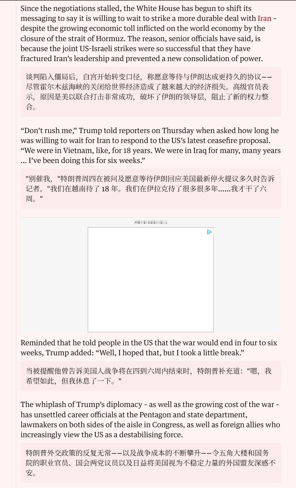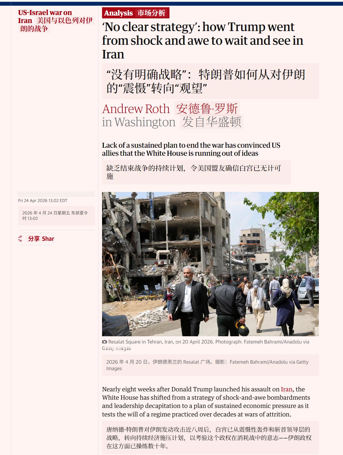 🔻英国《卫报》在一篇分析中写道,美国缺乏一个持久的结束伊朗战争计划,使美国的盟