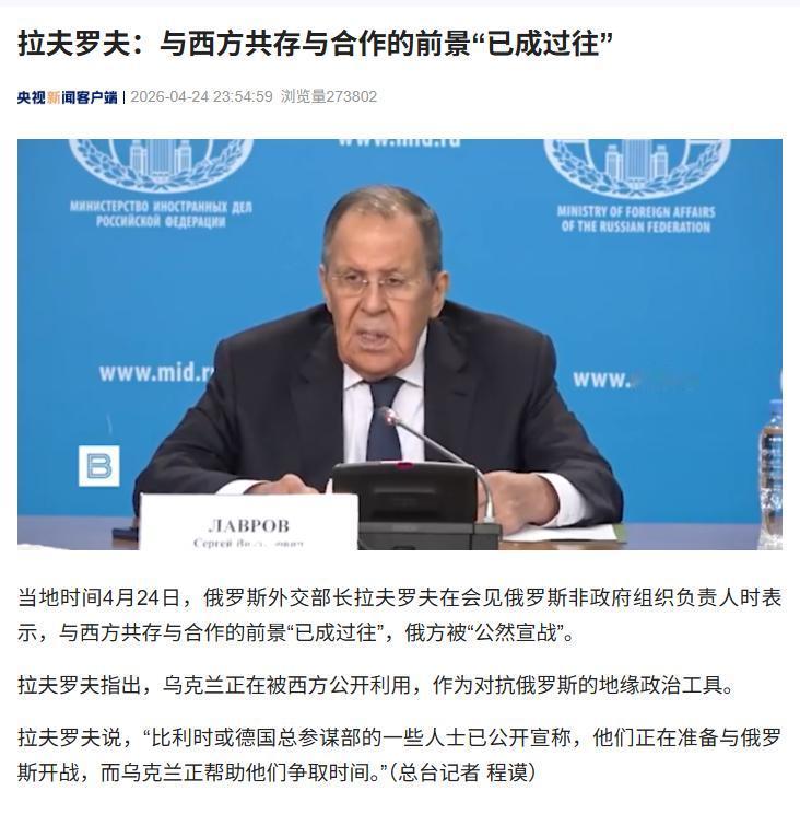 4月25日,俄罗斯外长拉夫罗夫公开宣布了一个石破天惊的判断:与西方共存与合作的前景“已成过往”,俄方已经被“公然宣战”。