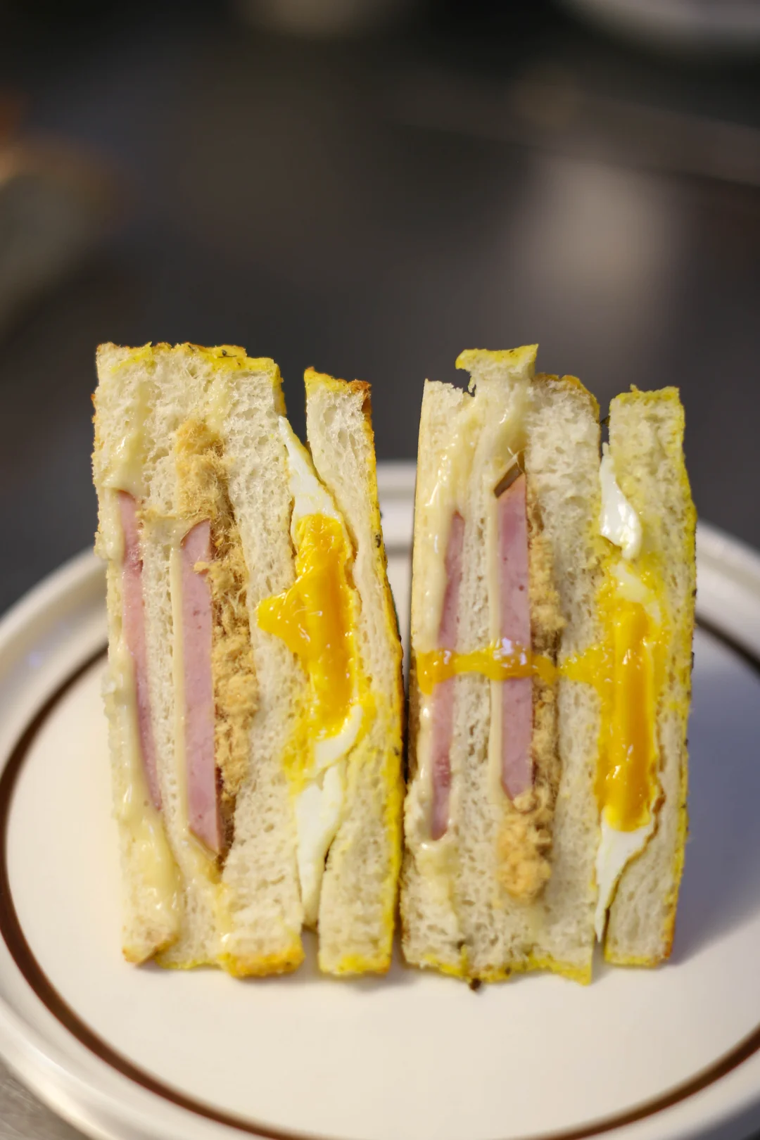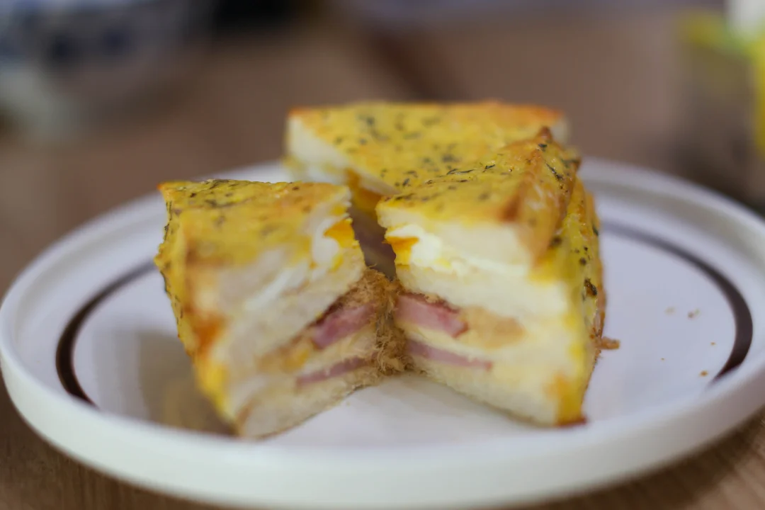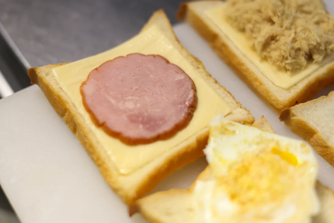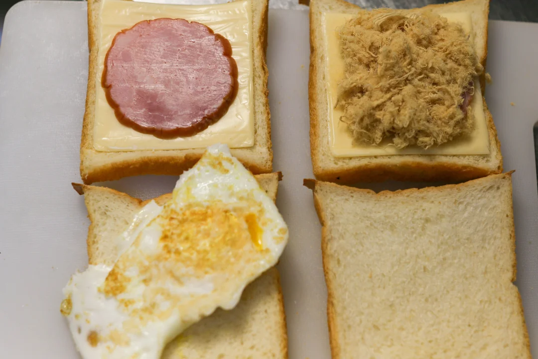 芝士和火腿是经典组合,又把肉松加到三明治里,咸甜交错,口感变得很丰富,一口咬下去,肉松酥酥的,火腿有嚼劲,芝士黏黏的,像是一个小型的味觉交响曲。