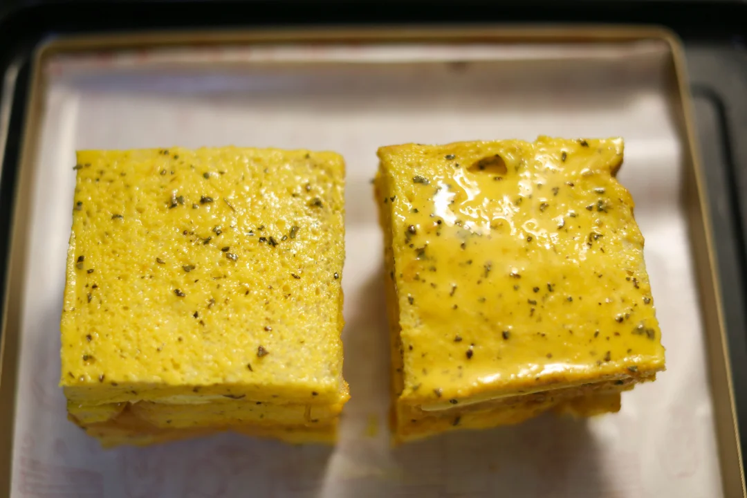 4️⃣:在准备好的吐司上下左右全部把蛋黄液涂抹上去。