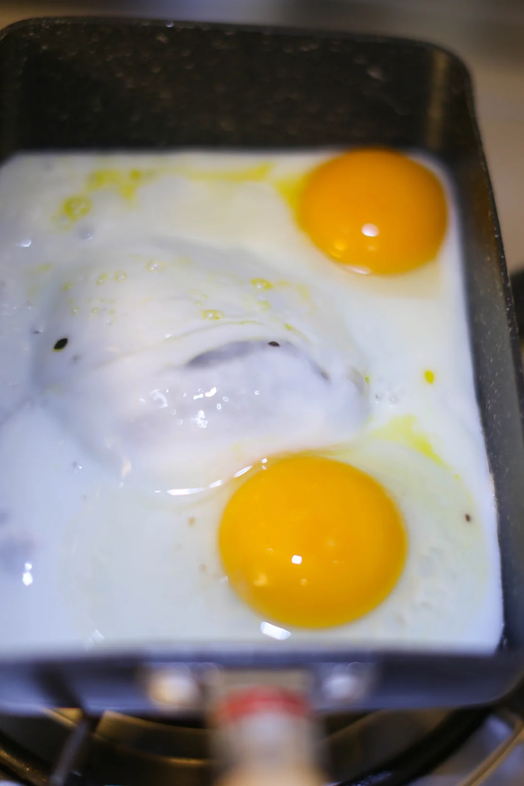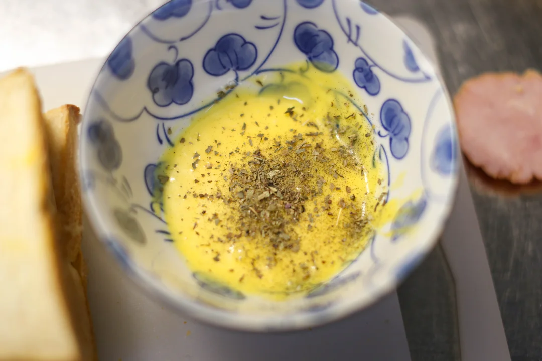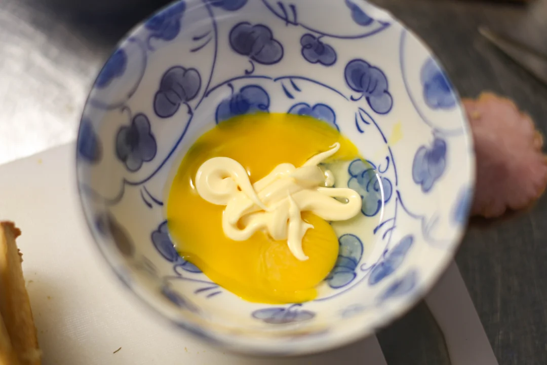 3️⃣:准备一个蛋黄,加入一点沙拉酱,加入一点罗勒叶,搅拌均匀。