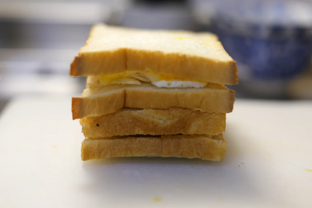 2️⃣:4片面包平放在案板上,每一片上面分别放上鸡蛋、火腿芝士、肉松,依次堆叠在一起之后,把吐司的边去掉。