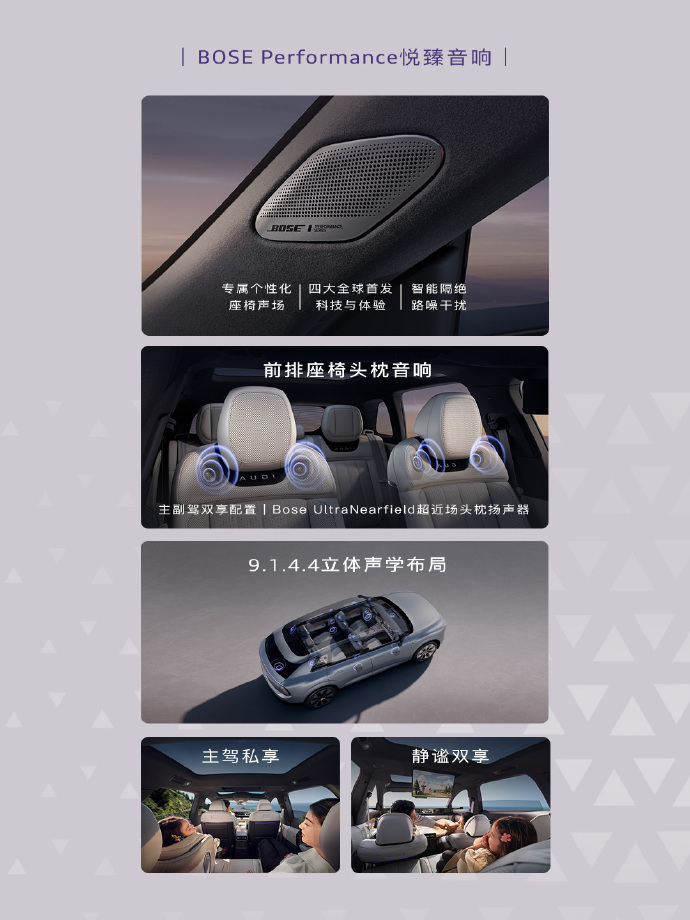 真正让我“哇塞”的,是它的自定义场景模式功能。想瘫着看场电影?不用挨个调音响、灯光、空调、座椅……一句“进入影院模式”,BOSE Performance音响、氛围灯、座椅姿态全部同步到位。奥迪E7X的Bose音响6大技术首发,搭载的PSR智能音频引擎和3DX空间音频重构技术效果超级惊艳——声音不再是平面铺开,而是从四面八方把你包裹住,每个座位都是c位”,尤其最好听的零重力女王副驾,头枕 Bose UltraNearfield 超近场扬声器是全球唯一,人耳距离能做到毫米级控制,低频下潜能到200赫兹,连一根银针落地都像贴着耳朵私语。配合关上车门后的静谧,整个人像被吸进电影里。