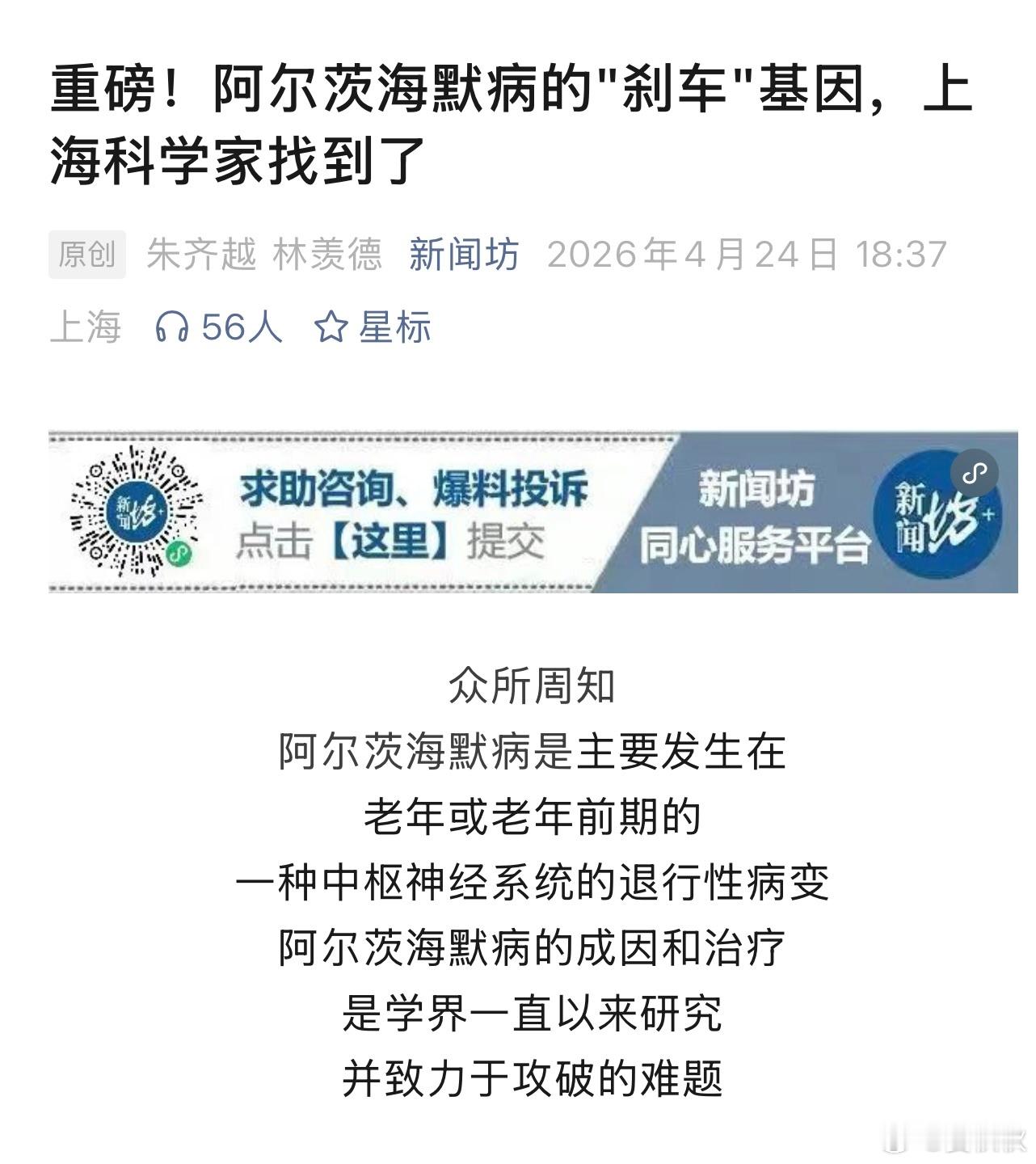 人类距离攻克阿尔茨海默病,又进一步。根据“新闻坊”,《科学》杂志今天发表了上海科学家一项重磅科研成果。简单来说,就是科学家找到了让阿尔茨海默病能“刹车”甚至“倒车”的一个关键“开关”。在人类的大脑中,除了负责思考记忆的神经元,还有一大堆叫“星形胶质细胞”的东西。你可以把它们想象成神经元的“保姆”或者“保安”,平时负责给神经元送营养、打扫垃圾、维持秩序,是妥妥的“守护者”。但是,人得了阿尔茨海默病以后,怪事就发生了:这些“好保姆”不知道受了啥刺激,突然“黑化”了,变成了“坏保安”。它们不仅不干活了,还开始释放“毒素”,攻击它们本该保护的神经元,加速了大脑的损伤和记忆的丢失。科学家早就怀疑,控制这些“保姆”变好变坏的,是细胞内部的一些“总开关”(转录因子)。但人体里有上千个这样的“开关”,过去的技术只能一个一个去试,跟大海捞针一样,效率极低,几十年都没啥大进展。那么,这次上海科学家的突破在哪呢?他们发明了一个“超级测试平台”。给这一千多个“开关指令包”每个都贴上独特的“条形码身份证”,然后用一种安全的“病毒快递车”,精准投送到小鼠大脑的“保姆细胞”里。接着,他们一口气读取了近40万个细胞的“工作日志”,终于画出了全世界第一张“大脑保姆细胞功能地图”。有了这张“地图”,找关键开关就快多了。他们从一千多个里迅速锁定39个候选,最后发现了一个“开关”(Ferd3l)特别厉害,堪称“最强刹车”。在得了阿尔茨海默病的小鼠身上,科学家特意把这个“开关”打开。结果很神奇:“坏保姆”变回了“好保姆”:黑化的细胞被“驯化”了,不再释放毒素。大脑炎症消停了:脑子里的“火灾”(炎症)被扑灭了。神经元得救了:神经细胞不再大量死亡。记忆力回来了:生病的小鼠在走迷宫、认新东西这些测试里,表现变得和健康小鼠差不多,认知能力基本恢复到了正常水平。这不仅仅是“刹车”,甚至是“倒车”了。这个发现之所以重要,是因为它跳出了过去几十年只盯着大脑里“老年斑”(Aβ蛋白)的死胡同,从一个全新的角度(维护好“保姆细胞”)找到了治疗的可能。说到这里,我们还要冷静一下。这个发现,绝对是世界级的重大突破。但是,它距离变成让普通患者受益的药物,最乐观估计也需要几年的时间。当然,这样的科学发现也提醒我们,对于家里的老人,现阶段最好的“药”依然是健康的生活方式、均衡的饮食、积极的社交和乐观的心态。