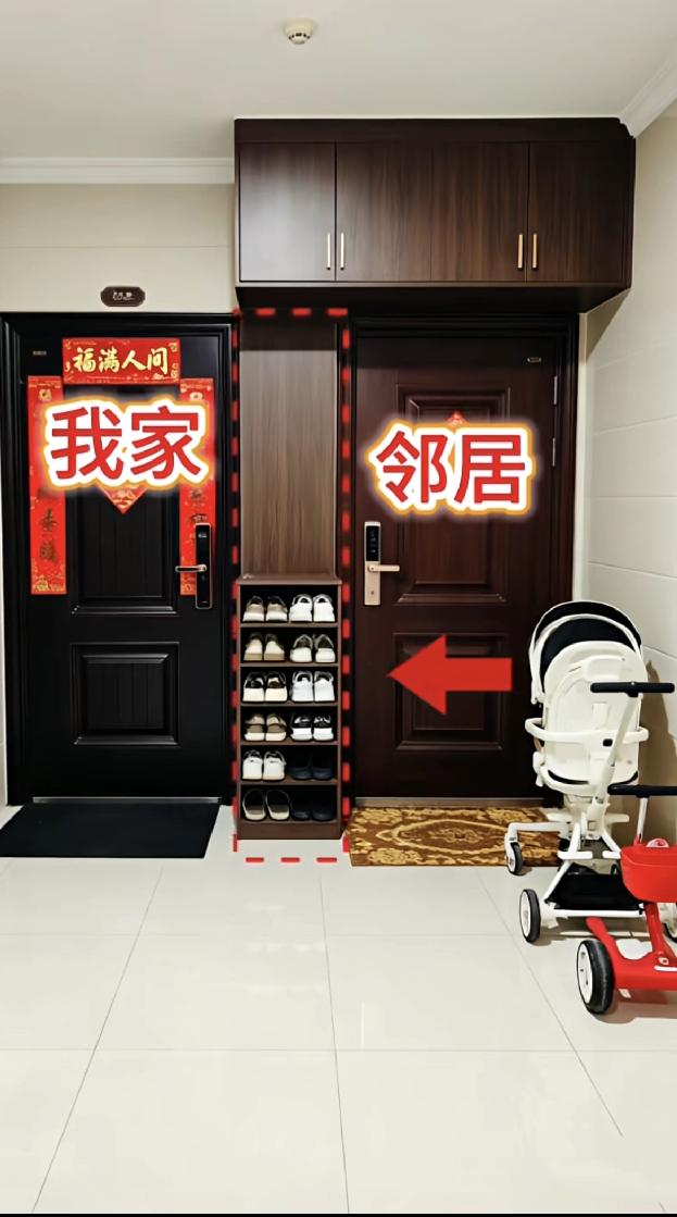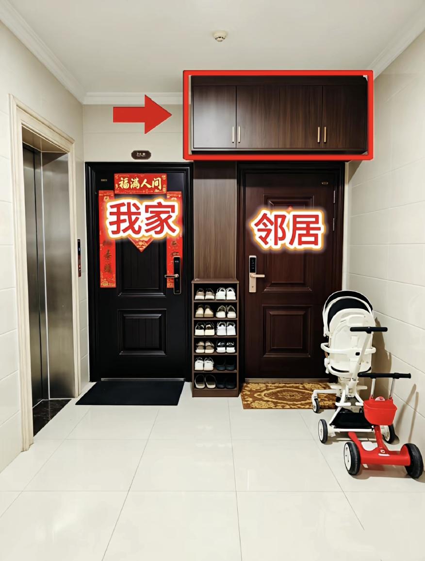 我家那个位置挺吃亏呀,邻居家占的满满当当,又是鞋柜,又是婴儿车, 连门顶上还打个悬柜,遇见这种事,应该怎么办?