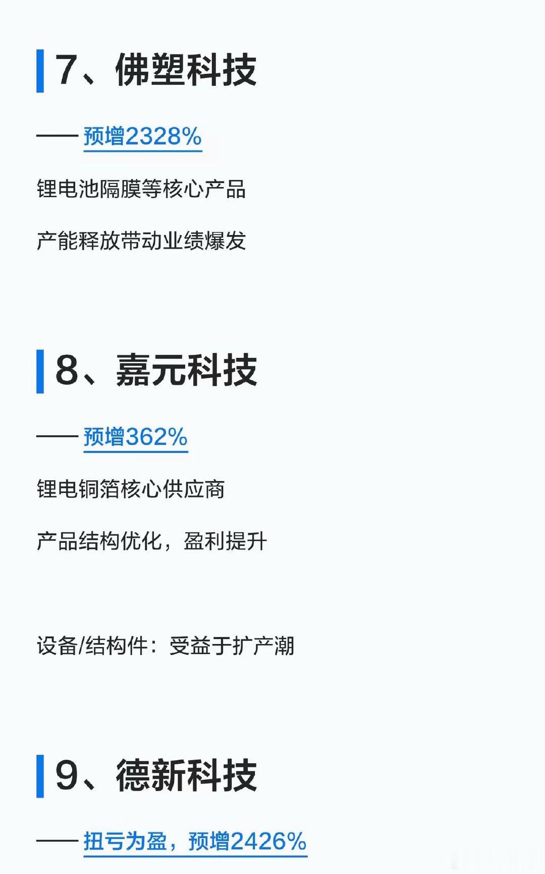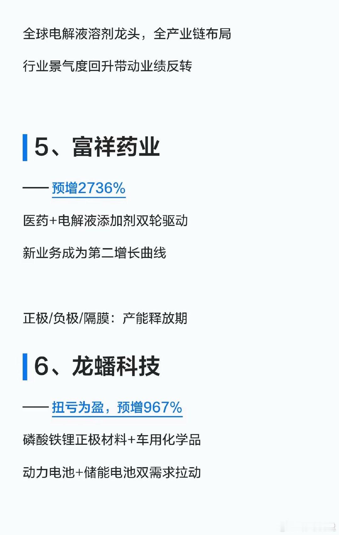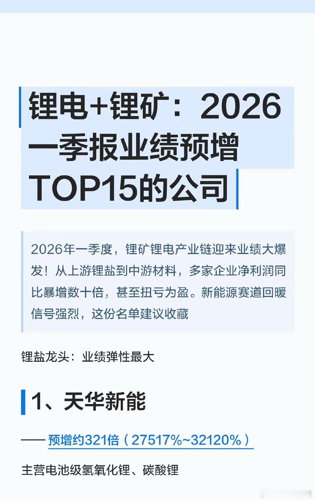 锂电大反转!2026一季报业绩预增TOP15名单曝光,收藏好!家人们!锂矿锂电的业绩“王炸”来了!2026年一季度,从锂盐到材料、从设备到金属,全产业链业绩集体爆发!有的直接预增超300倍,有的从巨亏直接扭亏,新能源赛道的回暖信号,这次是真的打在脸上了!给大家整理了业绩预增TOP15的核心名单,按产业链分好了,直接抄作业👇🔹锂盐龙头(业绩弹性最大)1. 天华新能:预增约321倍(27517%~32120%)2. 天齐锂业:预增1674%3. 赣锋锂业:扭亏为盈,预增620%🔹电解液/溶剂(行业景气度回升)4. 石大胜华:扭亏为盈,预增1099%5. 富祥药业:预增2736%🔹正负极/隔膜(产能释放期)6. 龙蟠科技:扭亏为盈,预增967%7. 佛塑科技:预增2328%8. 嘉元科技:预增362%🔹设备/结构件(受益扩产潮)9. 德新科技:扭亏为盈,预增2426%10. 震裕科技:预增298%🔹能源金属(钴铜镍锂全面开花)11. 腾远钴业:预增330%12. 中矿资源:预增290%13. 盛屯矿业:预增261%🔹其他高增标的14. 神火股份:预增218%15. 奥来德:预增205%💡核心逻辑总结:锂价触底反弹+新能源需求回暖+产能释放,是这次业绩暴增的核心!上游锂盐弹性最大,中游材料受益扩产,设备端吃订单红利。关注我,后续继续拆解锂电赛道的机会和风险,不迷路!