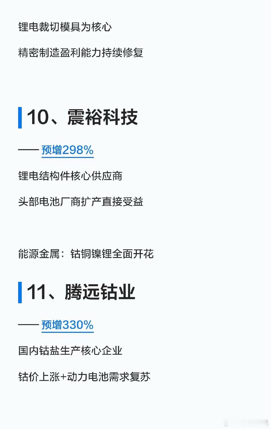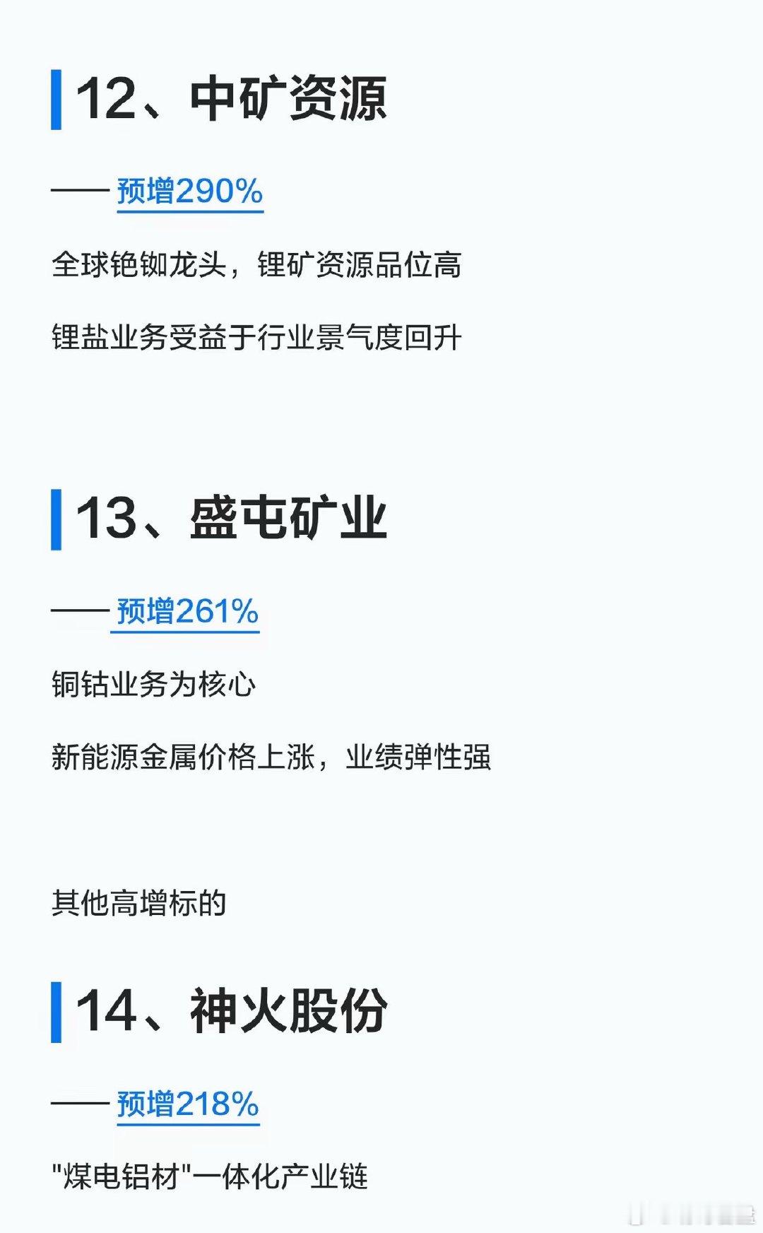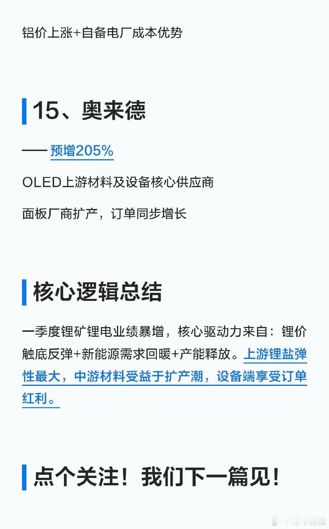 锂电大反转!2026一季报业绩预增TOP15名单曝光,收藏好!家人们!锂矿锂电的业绩“王炸”来了!2026年一季度,从锂盐到材料、从设备到金属,全产业链业绩集体爆发!有的直接预增超300倍,有的从巨亏直接扭亏,新能源赛道的回暖信号,这次是真的打在脸上了!给大家整理了业绩预增TOP15的核心名单,按产业链分好了,直接抄作业👇🔹锂盐龙头(业绩弹性最大)1. 天华新能:预增约321倍(27517%~32120%)2. 天齐锂业:预增1674%3. 赣锋锂业:扭亏为盈,预增620%🔹电解液/溶剂(行业景气度回升)4. 石大胜华:扭亏为盈,预增1099%5. 富祥药业:预增2736%🔹正负极/隔膜(产能释放期)6. 龙蟠科技:扭亏为盈,预增967%7. 佛塑科技:预增2328%8. 嘉元科技:预增362%🔹设备/结构件(受益扩产潮)9. 德新科技:扭亏为盈,预增2426%10. 震裕科技:预增298%🔹能源金属(钴铜镍锂全面开花)11. 腾远钴业:预增330%12. 中矿资源:预增290%13. 盛屯矿业:预增261%🔹其他高增标的14. 神火股份:预增218%15. 奥来德:预增205%💡核心逻辑总结:锂价触底反弹+新能源需求回暖+产能释放,是这次业绩暴增的核心!上游锂盐弹性最大,中游材料受益扩产,设备端吃订单红利。关注我,后续继续拆解锂电赛道的机会和风险,不迷路!
