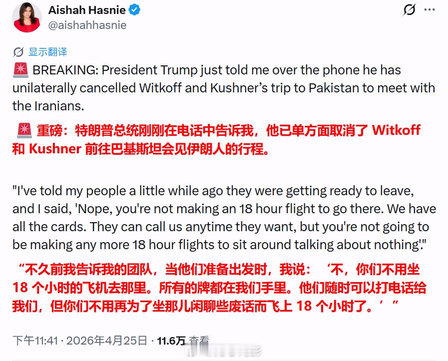 福克斯新闻的白宫记者发帖称,特朗普刚刚在电话里告诉他,他已单方面取消了 威特科夫与库什纳 前往巴基斯坦会见伊朗人的行程。特朗普的理由是:“所有的牌都在我们手里。他们随时可以打电话给我们,但你们不用再为了坐那儿闲聊些废话而飞上 18 个小时了。”而此前的消息称,伊朗外长早就离开巴基斯坦了。