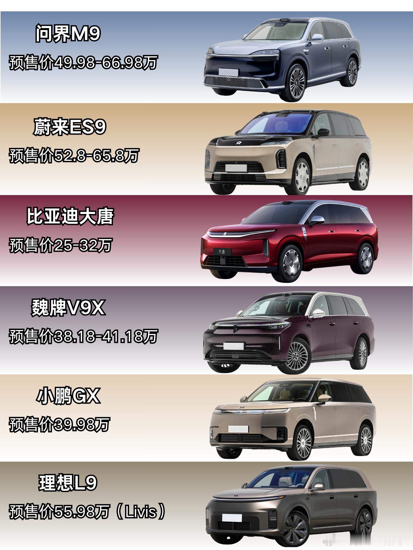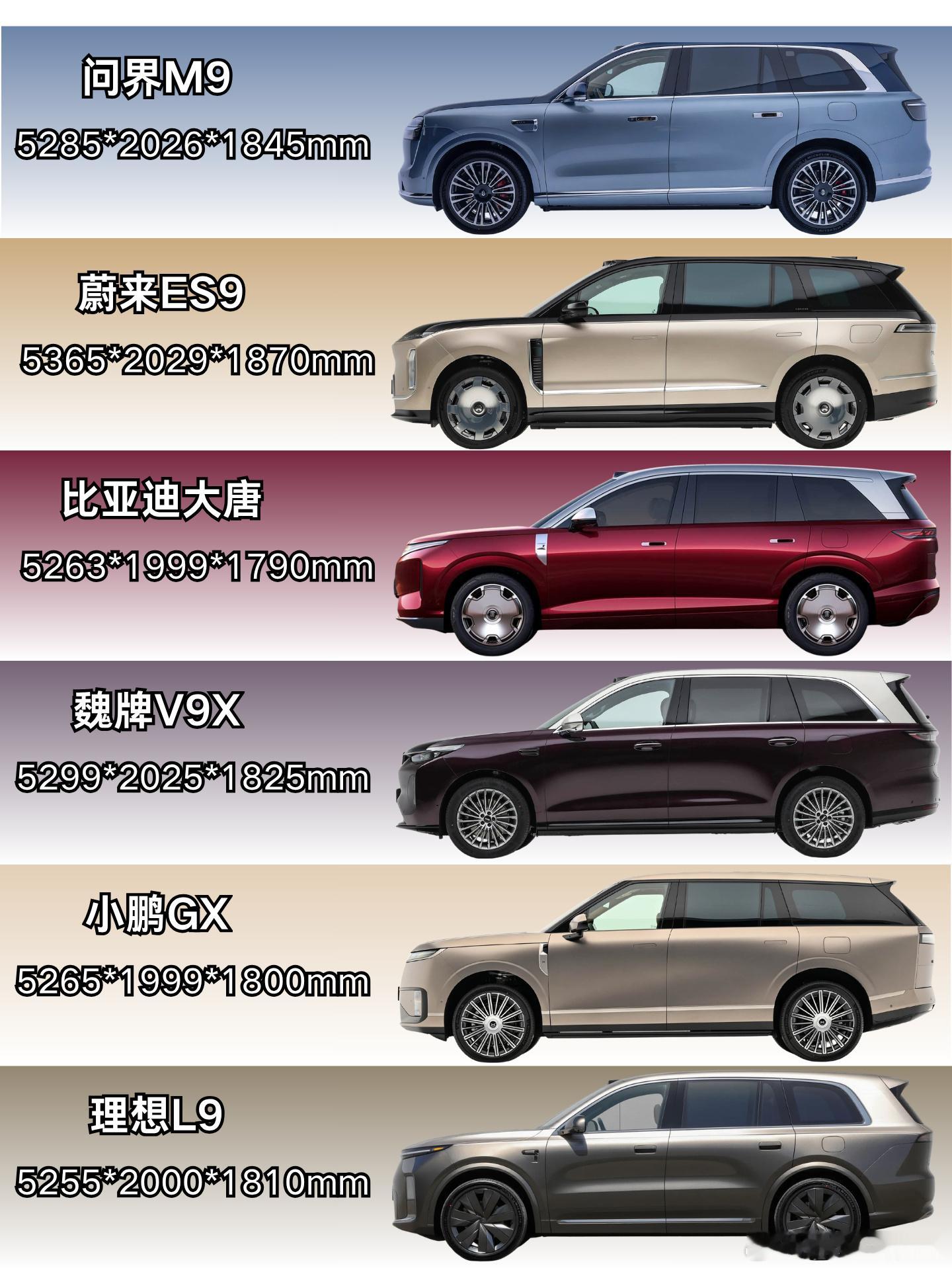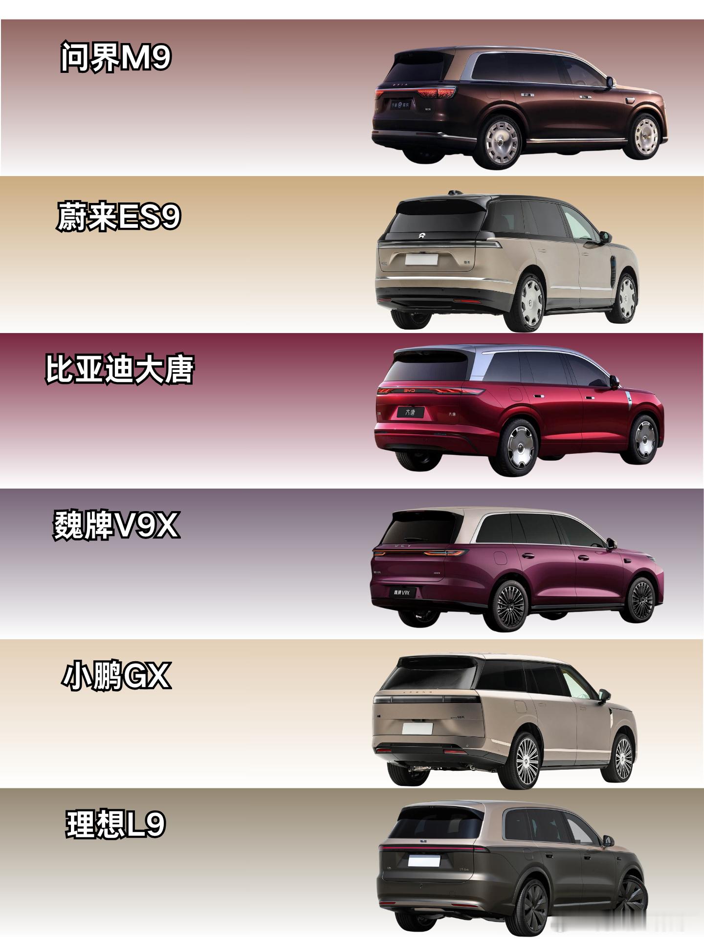 一众9系大车,一众5.2米大车,大家更看好谁?问界M9,蔚来ES9,比亚迪大唐,魏牌V9X,小鹏GX,理想L9,市场竞争太理解了。昨天摸了下实车,感觉蔚来ES9比问界M9还要老登,没看懂。