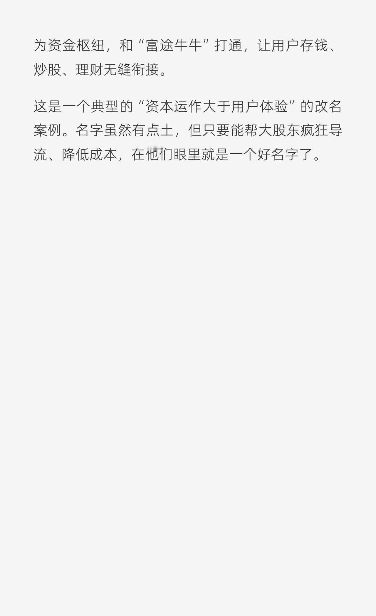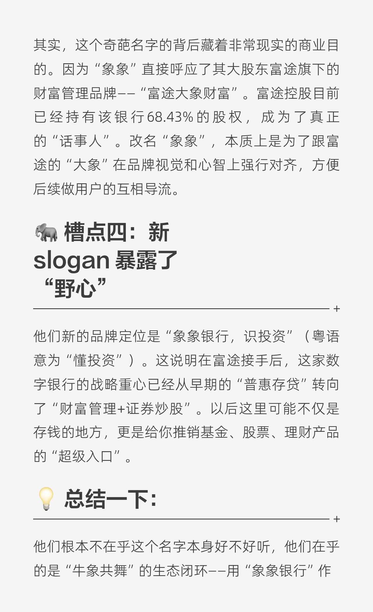💡 难听是完全正常的直觉,但站在股东的视角,他们根本不在乎这个名字本身好不好听,他们在乎的是“牛象共舞”的生态闭环——用“象象银行”作为资金枢纽,和“富途牛牛”打通,让用户存钱、炒股、理财无缝衔接。这是一个典型的“资本运作大于用户体验”的改名案例。名字虽然有点土,但只要能帮大股东疯狂导流、降低成本,在他们眼里就是一个好名字了。银行 香港 香港银行