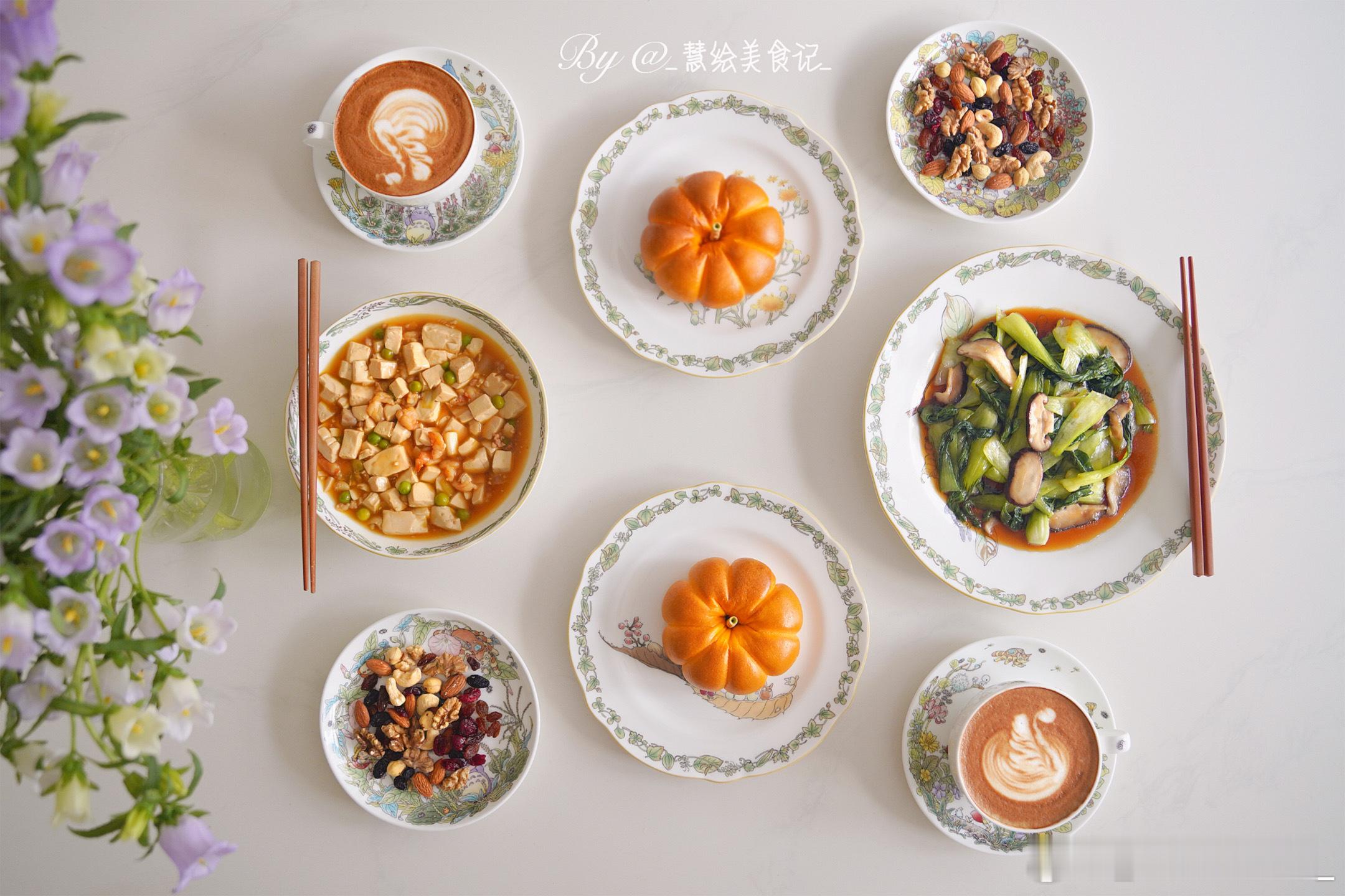 周末愉快早餐南瓜贝果、拿铁咖啡、虾仁豆腐、香菇油菜、小米粥、坚果~我的美食日记