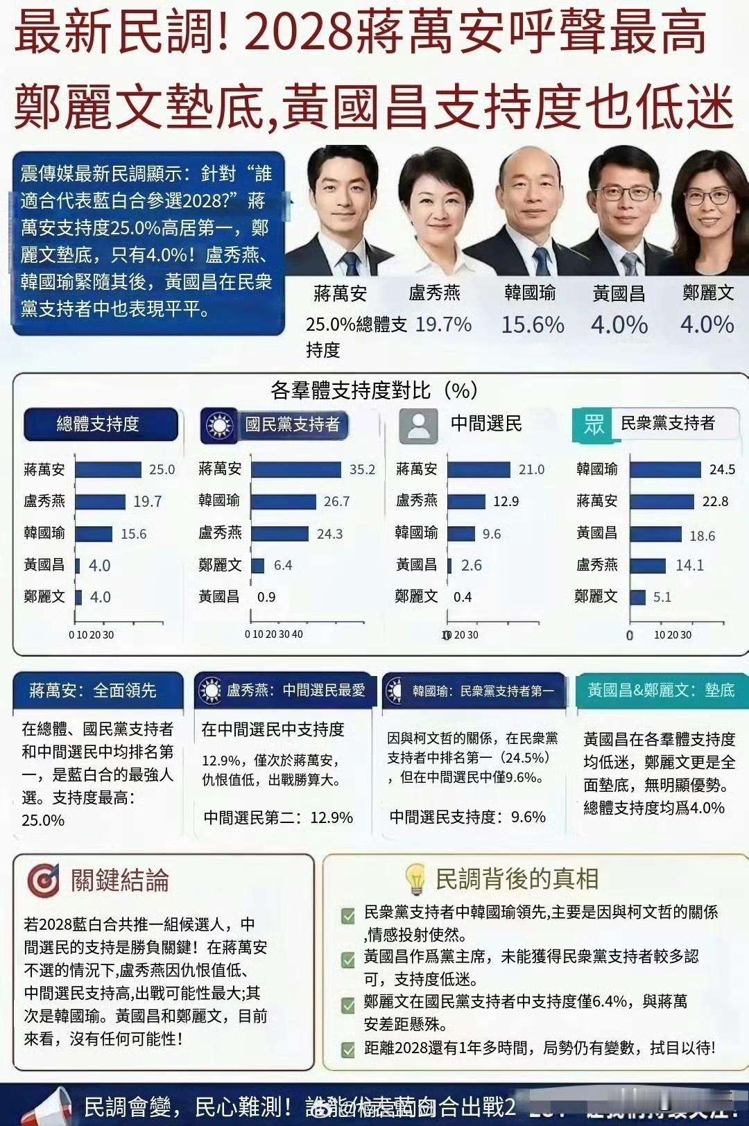 近日,岛内民调机构所做的2028选举调查结果显示,卢秀燕和韩国瑜分别以19.7%和15.6%的支持率位列第二、三位,而身为国民党主席的郑丽文,其支持率竟然只有4%,令人大跌眼镜。