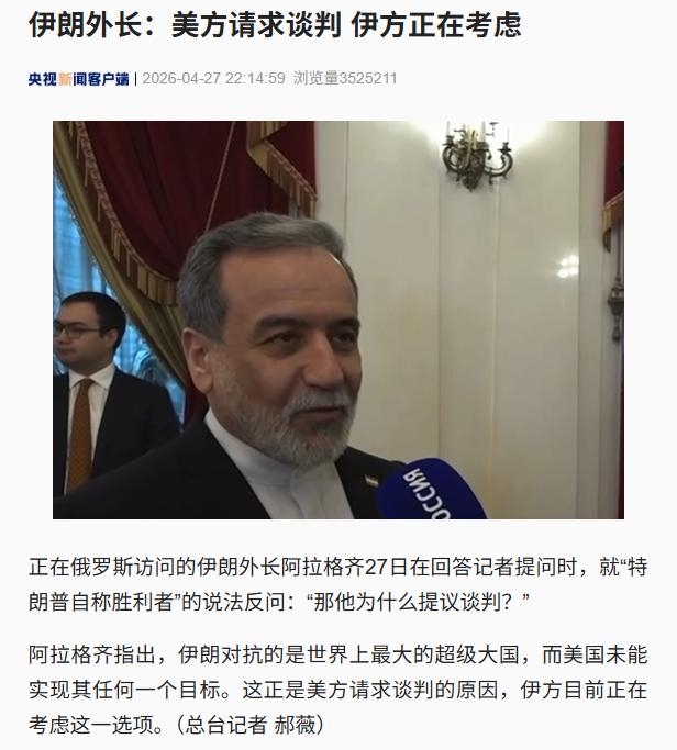 4月27日,伊朗外长阿拉格齐在俄罗斯访问期间,有记者问:特朗普说自己是胜利者,你怎么看?他没直接反驳,而是反问了一句:那他为什么主动找伊朗谈判?至于谈不谈,伊朗还在考虑。