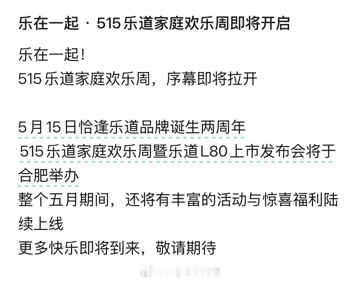 乐道家庭欢乐周又要举办了!L80将于5月15日在合肥正式上市!乐道l80双舱超级