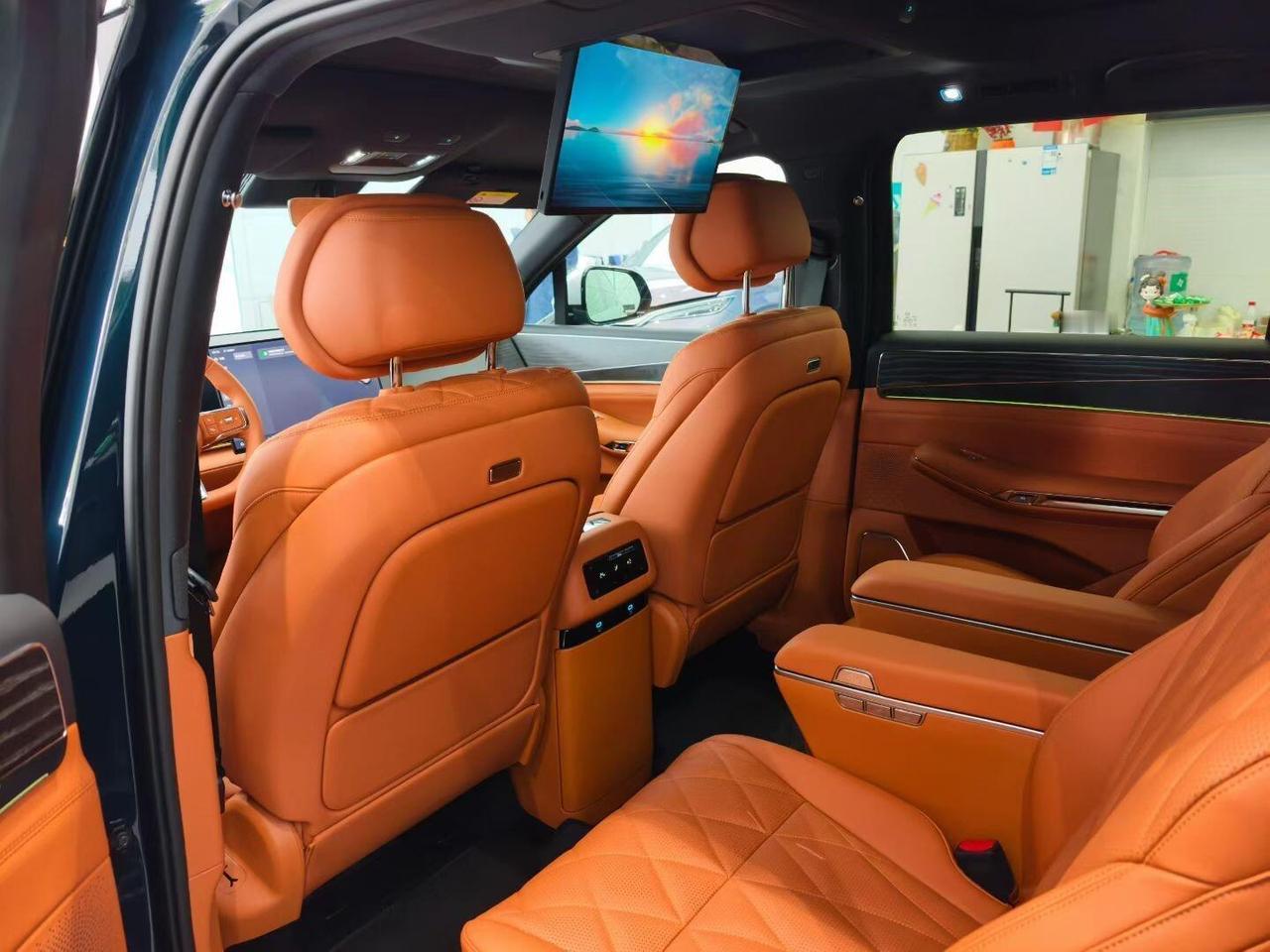 进到车内,悬浮中控大屏+内嵌仪表和副驾屏+HUD,科技氛围到位。座椅是2+2+3七座布局,前排和第二排都是零重力/零压航空座椅,通风、加热、10点按摩全标配。第二排靠背可调至146°,带70°电动腿托,加上17.3英寸吸顶屏、冷暖冰箱、帝瓦雷音响,长途乘坐体验不错。第三排也能加热和放平。