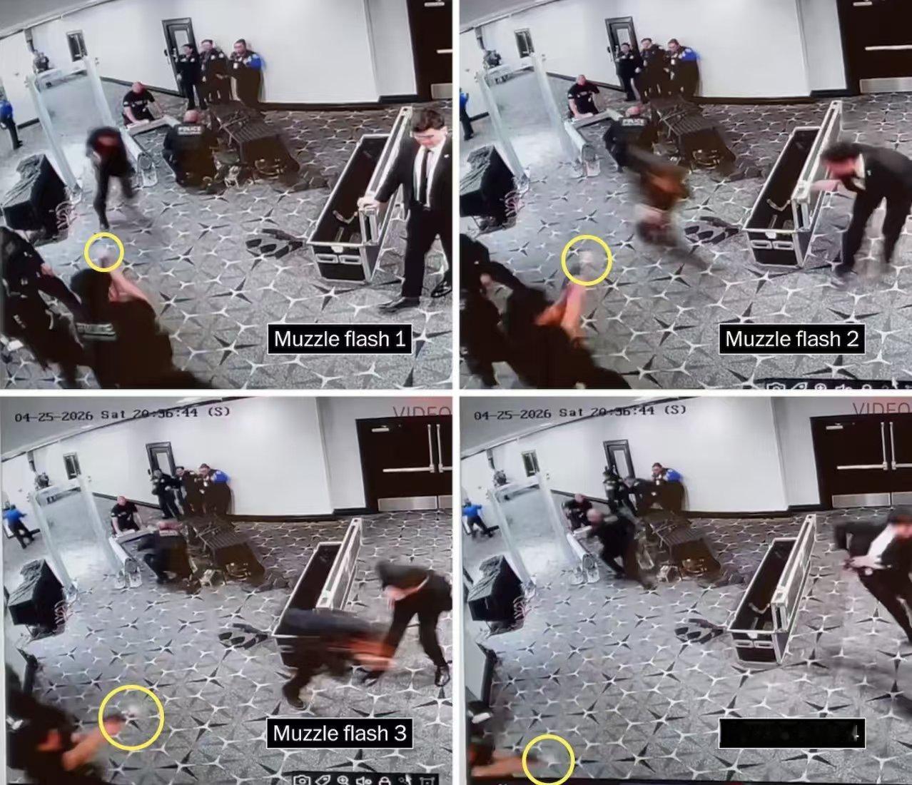 华盛顿邮报曝光的白宫记者晚宴枪击现场监控,发现美国特勤局连开四枪,都没有打死枪手