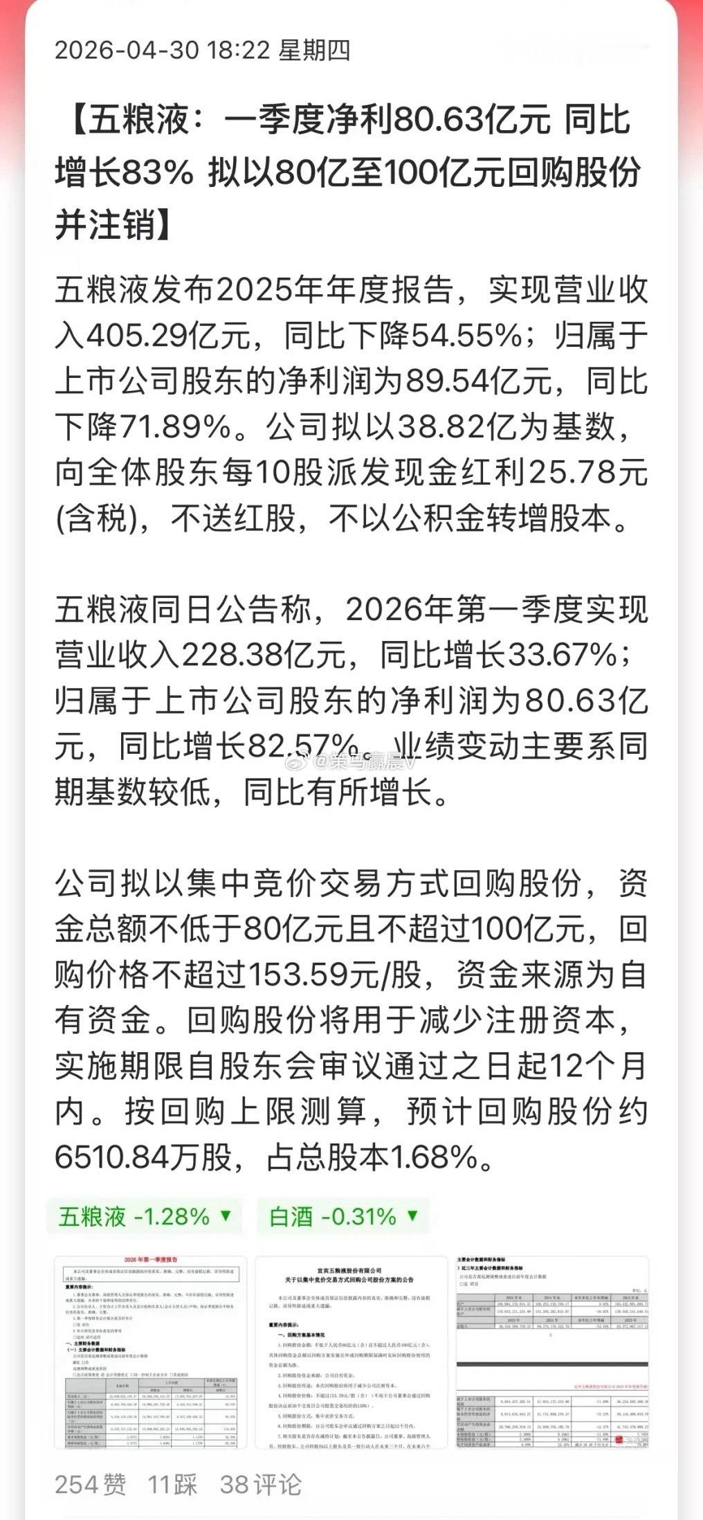 不过压低去年基数的好处,今年一季度净利润80多亿,直接暴涨82%,在白酒股中一枝独秀。五粮液股价已经创6年新低了,这次一季度大幅度增长+分红+大额回购,大家会买账么?看看节后市场如何投票。