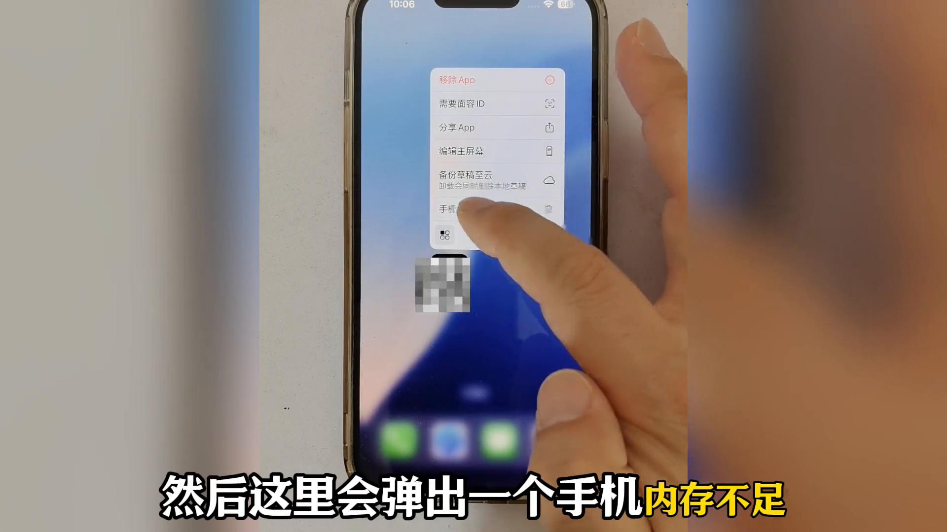 ·第三个功能叫做一键清理。这个功能用在平常p图软件、剪辑软件或者平常刷短视频的一些平台都可以这么操作。长按图标,这里会弹出一个手机内存不足、卡顿,点开之后自动的弹出,只需要点击确定就可以了,自动帮你清理干净,大家都可以去试一下。