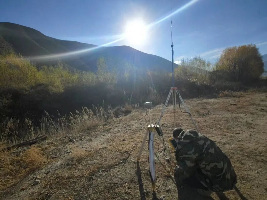 无人区的“通讯盲区”更让人犯难。传统测量方式无法精准定位钻探点,团队索性自主搭建临时基站:有人扛着近30公斤设备跋涉在雪山之间,有人跪在零下25℃的雪地里调试参数。最终,团队出色完成基站选址、设备安装与参数调试工作,有效规避地形遮挡等影响,确保了后续钻探点位的精准施放。