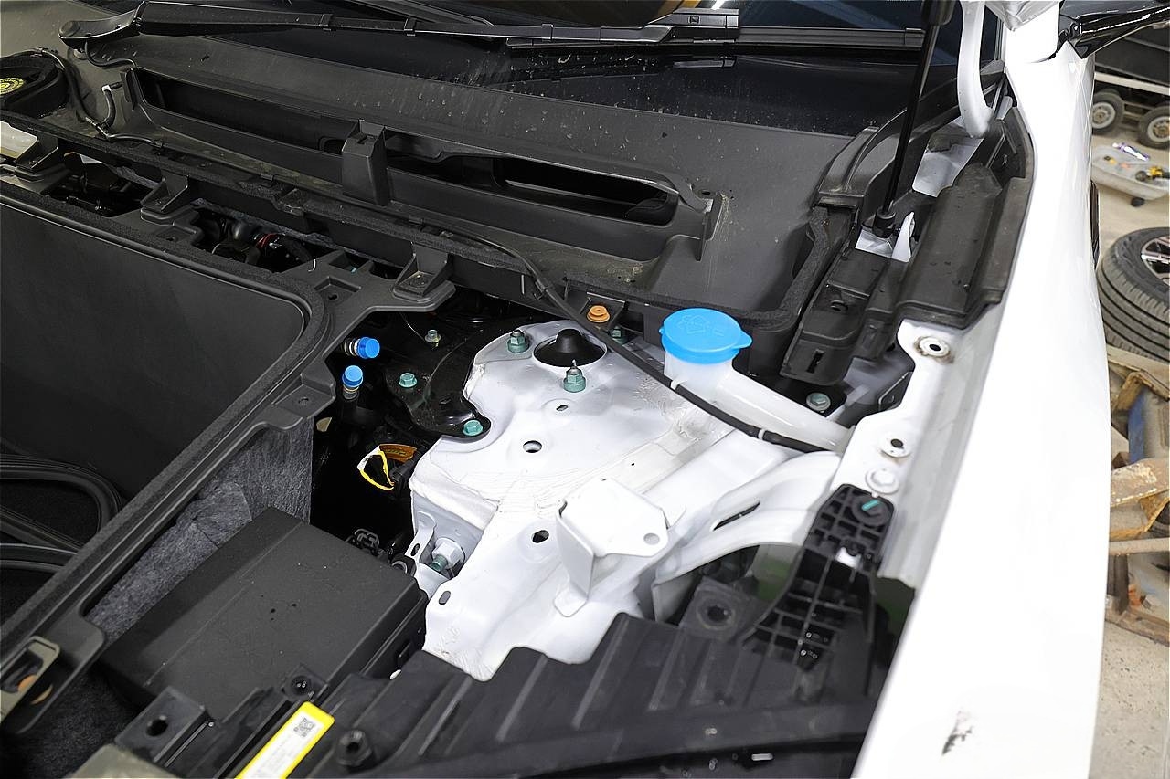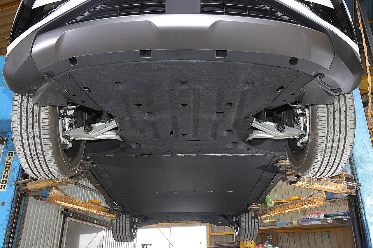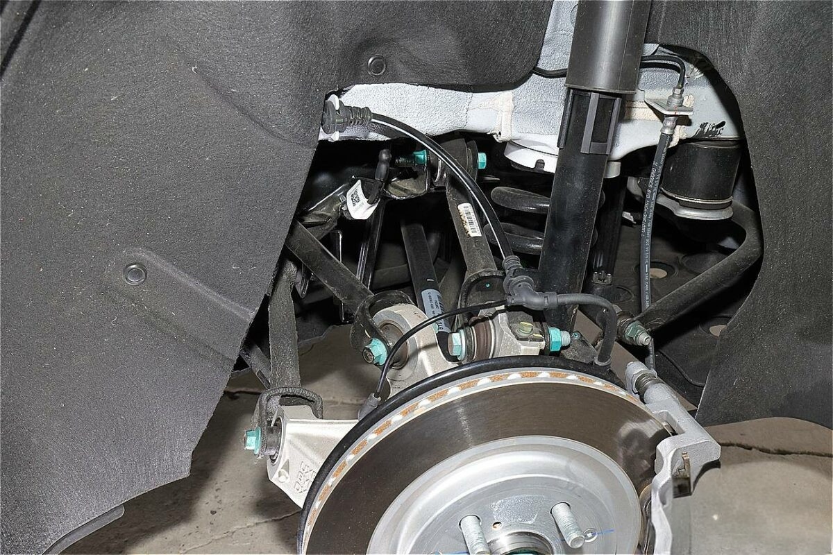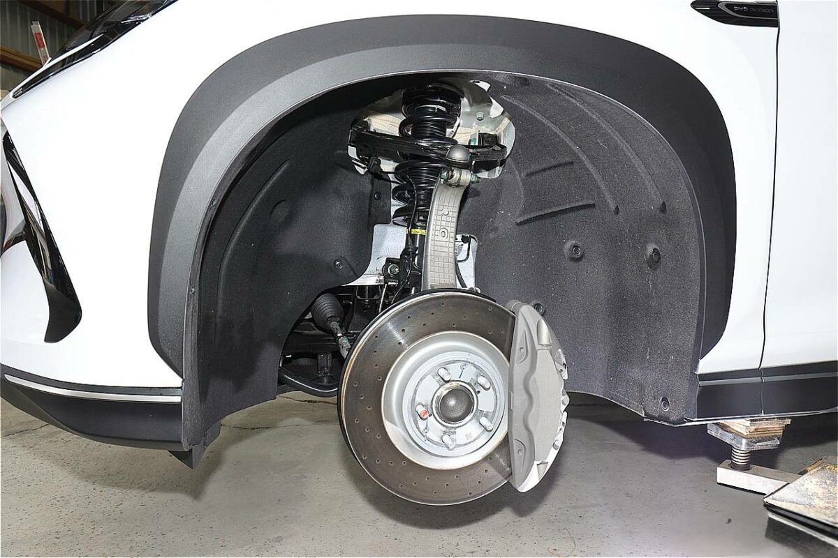 车辆被举升、轮胎拆卸后,前悬挂结构清晰展现:采用双叉臂式设计,所有控制臂均为铝合金材质,用料扎实坚固。北见贵弘评价,其结构设计与特斯拉相近,还融合了奔驰、宝马的经典设计优势。