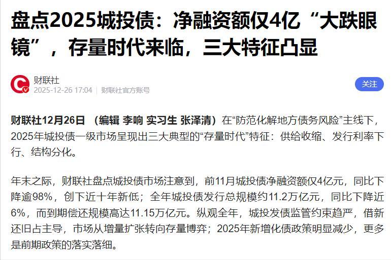 信息来源:盘点2025城投债:净融资额仅4亿“大跌眼镜”,存量时代来临,三大特征凸显