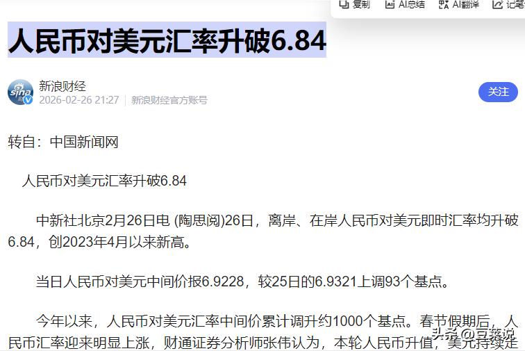 简单理解就是,以前换1美元要6.92元,现在只要6.82元,换同样多的美元能少花点钱,量大自然省得多。
