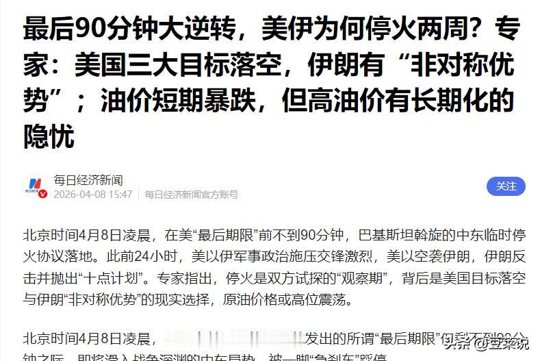 信息来源:最后90分钟大逆转,美伊为何停火两周?专家:美国三大目标落空,伊朗有“非对称优势”;油价短期暴跌,但高油价有长期化的隐忧