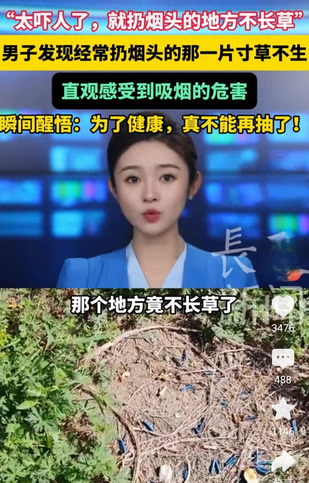 他长期扔烟头的那一小片草地,竟然光秃秃的,一根草都没有!而旁边没被烟头砸过的地方,绿油油的草长得正欢。两米之隔,一边是生命,一边是死亡。