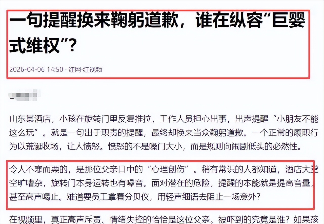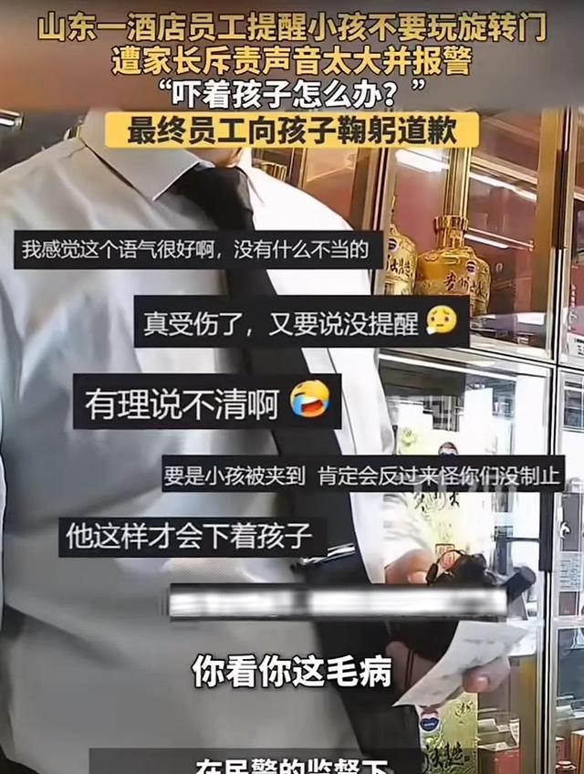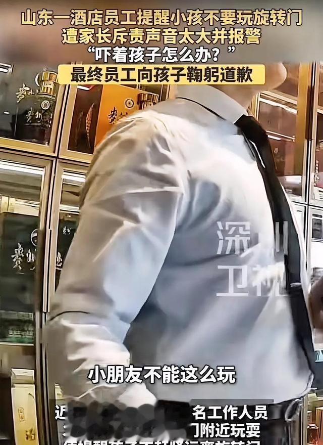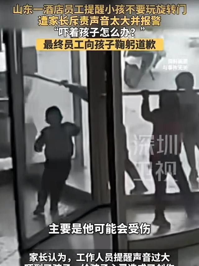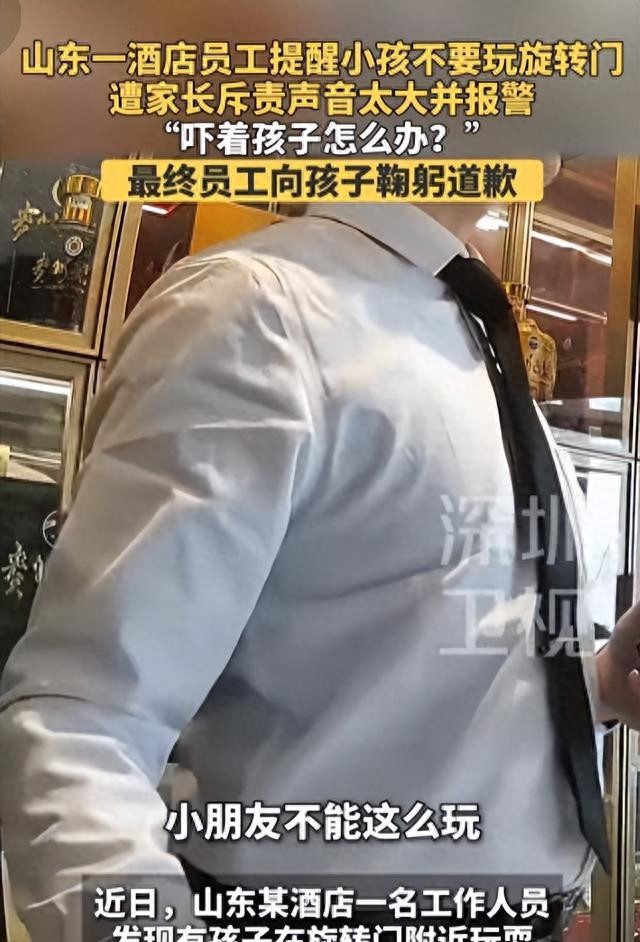 4月6日,新闻晨报官方账号报道了一则新闻,一名家长带孩子入住,孩子在酒店旋转门处反复推拉玩耍,工作人员出于安全考虑出声提醒,却被家长质疑声音太大、给孩子造成了“心理创伤”,最后家长报警,逼迫工作人员在民警监督下当面向孩子鞠躬道歉。