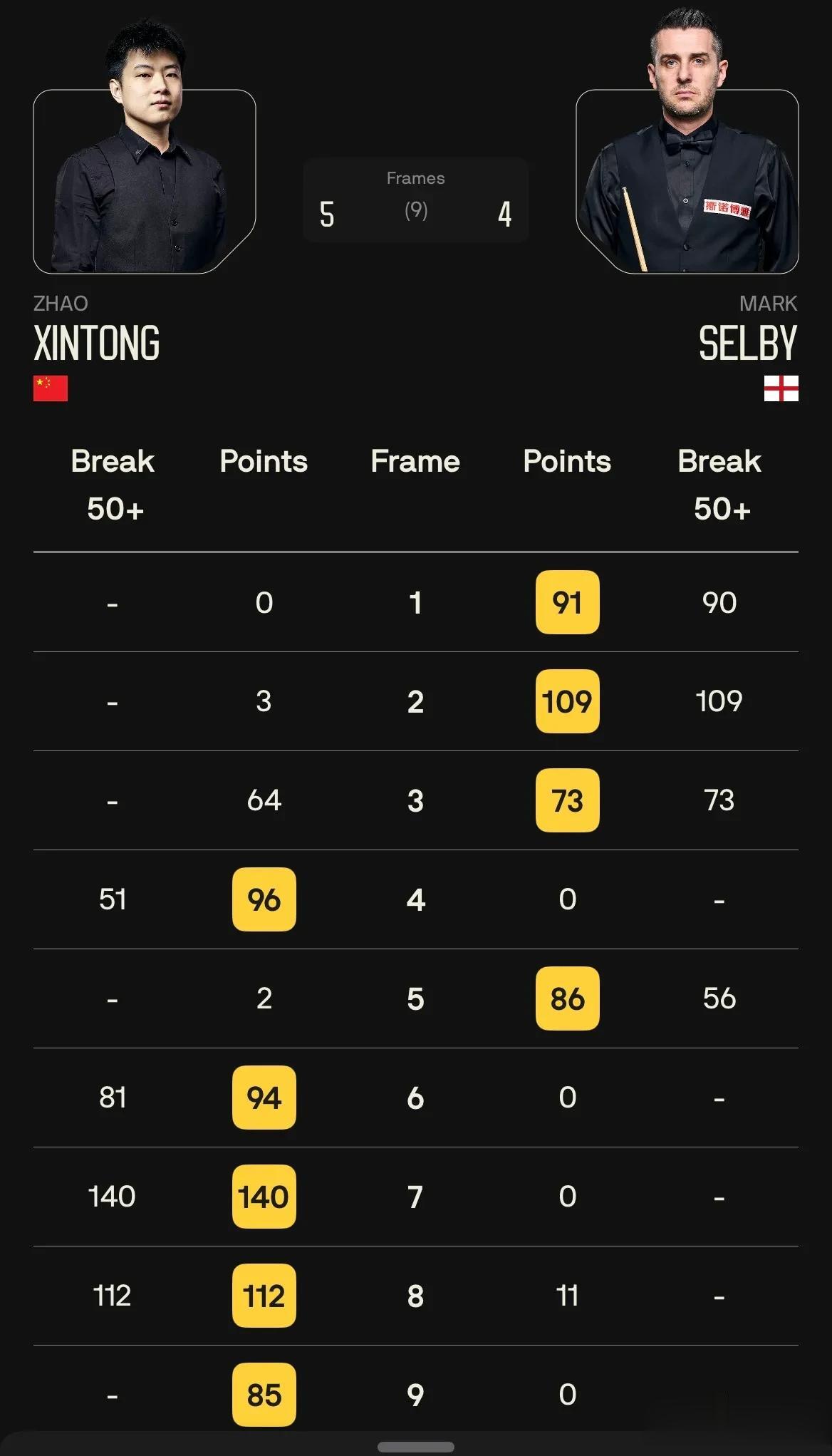 下半场我拿下第五局,单杆56分,4-1拿到赛点,这时候比赛看起来已经倾向我,但第六局赵心童打出单杆81分,挽救一个赛点,这一局他进攻果断,没有给我任何机会,第七局他更打出了单杆140分,这是全场最高分,显示了他的状态回升,第八局他又以单杆112分追平,连续两杆破百,说明他在压力下提升了专注度。