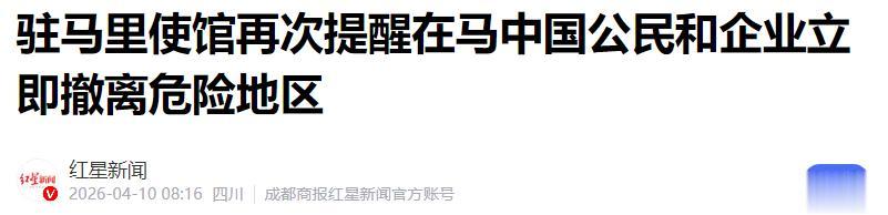红星新闻:驻马里使馆再次提醒在马中国公民和企业立即撤离危险地区 2026-04-10