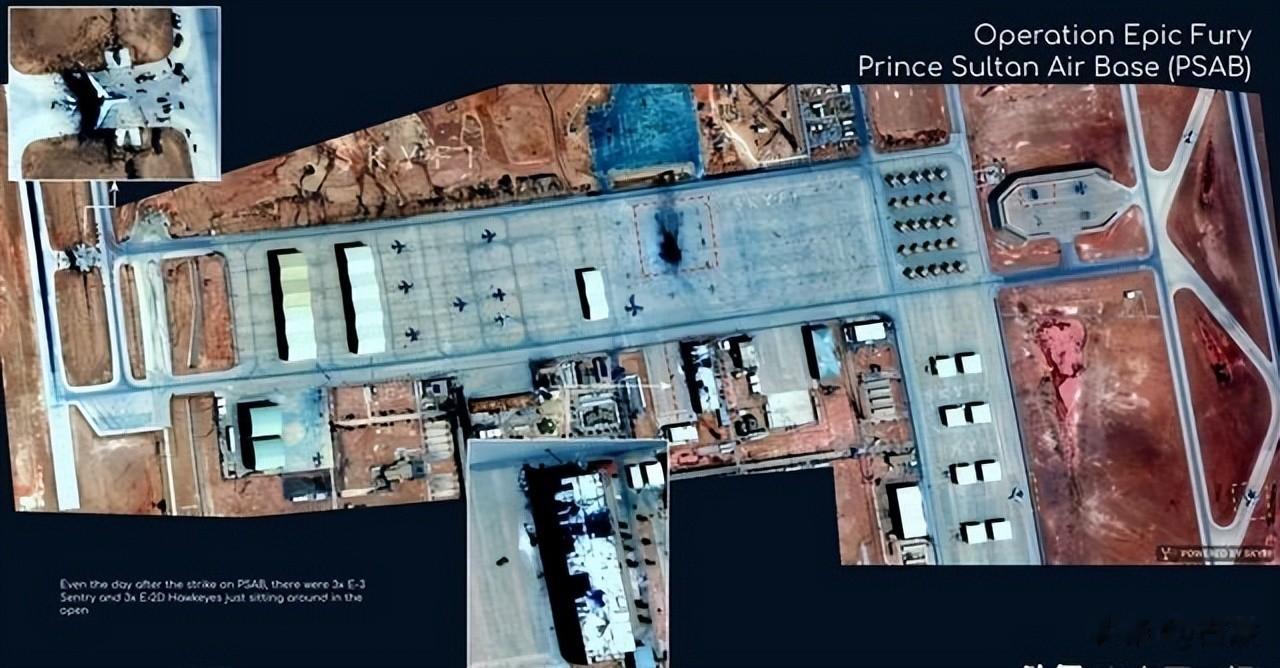接下来美军的操作才真叫人看不懂。卫星图清清楚楚地拍到:遭受重创之后,基地停机坪上还停着三架E-3预警机和三架E-2D"鹰眼"预警机,既没疏散也没加盖掩体,地面防空看不出增强的迹象。