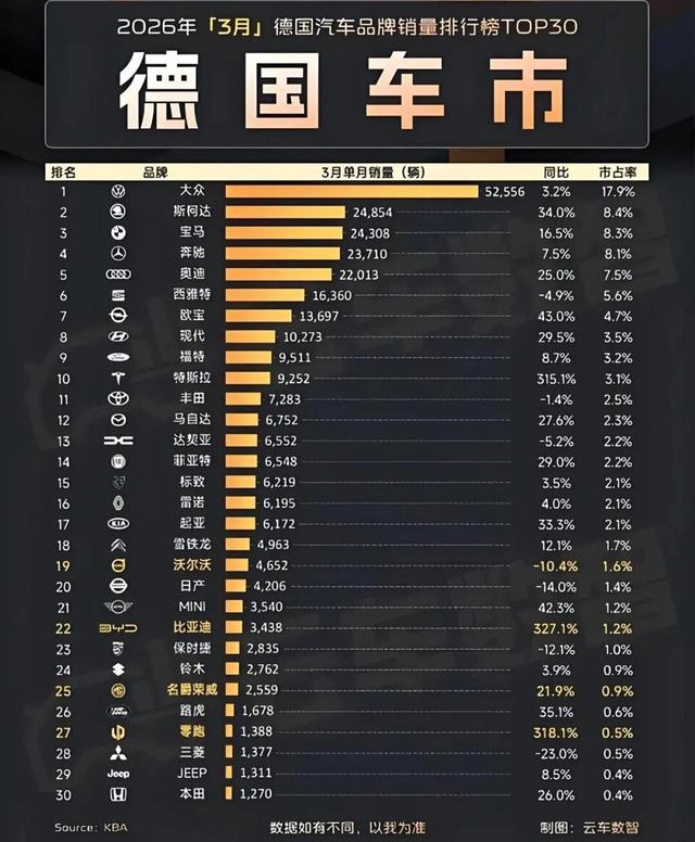 3月份,比亚迪在德国卖了3438辆,同比飙升327.1%;零跑卖了1388辆,涨幅318.1%。特斯拉也不甘示弱,9252辆的销量同比增长315.1%。就连传统品牌中,欧宝增长43%、奥迪增长25%、宝马增长16.5%,表现都相当亮眼。