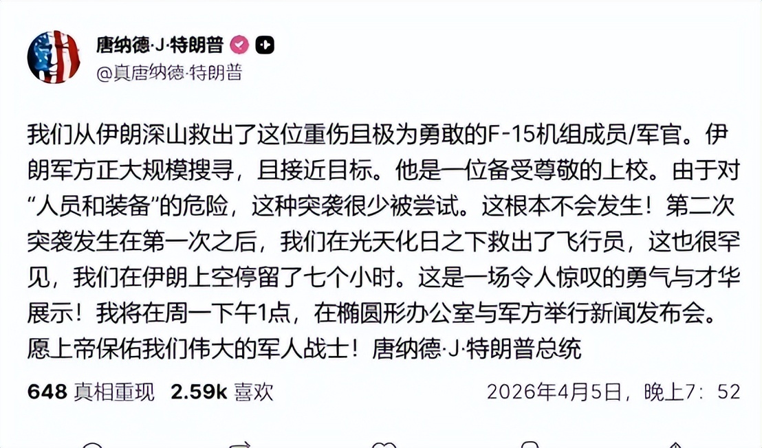 特朗普吹嘘:这玩意救了美军飞行员的命……——2026-04-07 10:42——观察者网