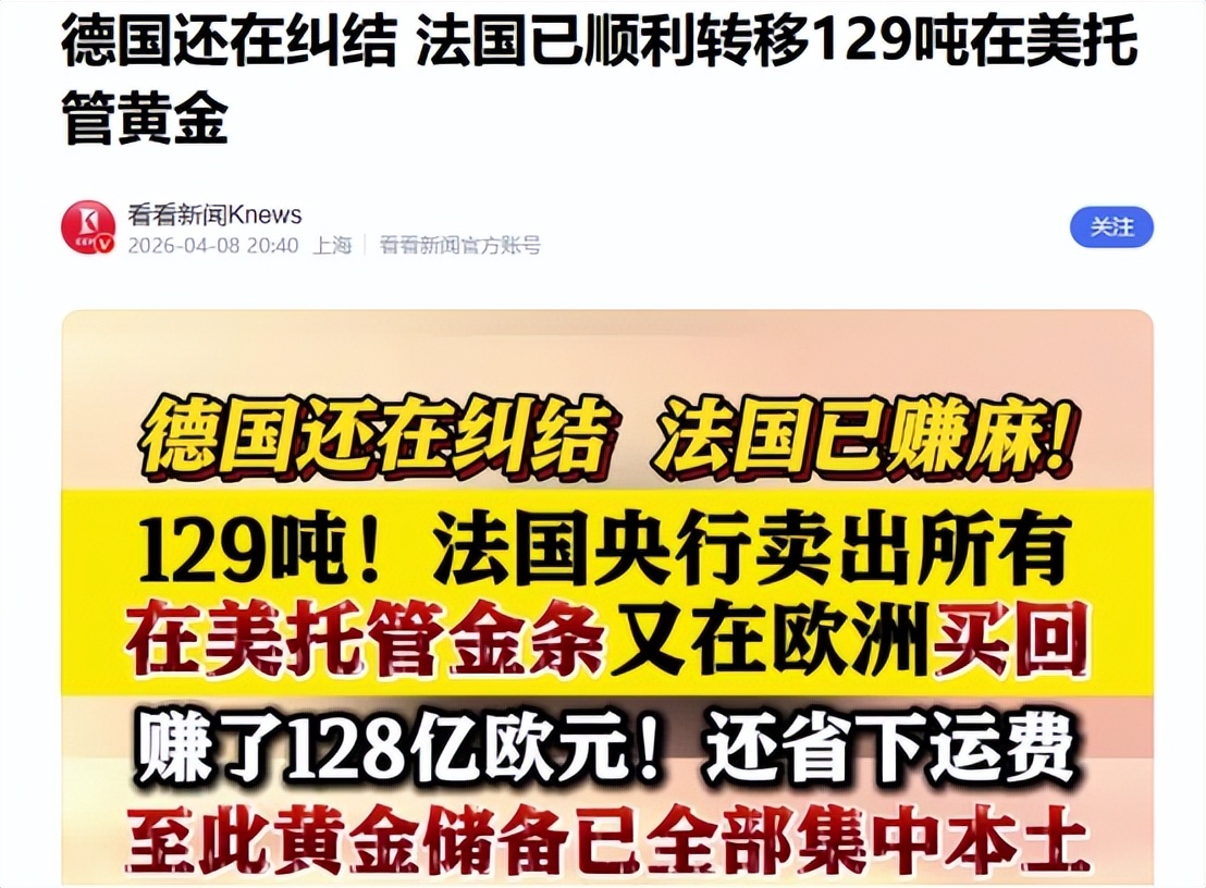 法国提前动手,中方罕见表态与此同时,美国在欧洲的重要盟友法国,在短时间内动作密集,急着和美国划清界限,第一个动作就是运回黄金,在4月7日当天,法国央行宣布要将存放在纽约银行长达近百年的129吨黄金运回本土。