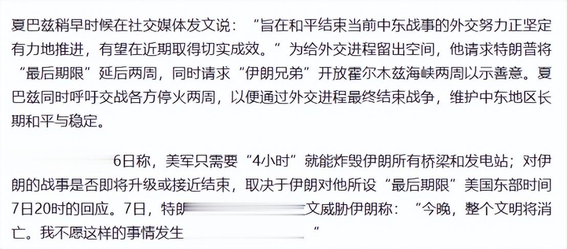到了4月7日傍晚,眼见大势已去,特朗普只能在社交媒体上发文,宣称暂停对伊朗的轰炸和袭击,短期停战两周,这场看似要爆发的战争在最后一刻被按下了暂停键,最后通牒彻底沦为国际笑话,美国的威慑力和战争信誉也因此大大降低。