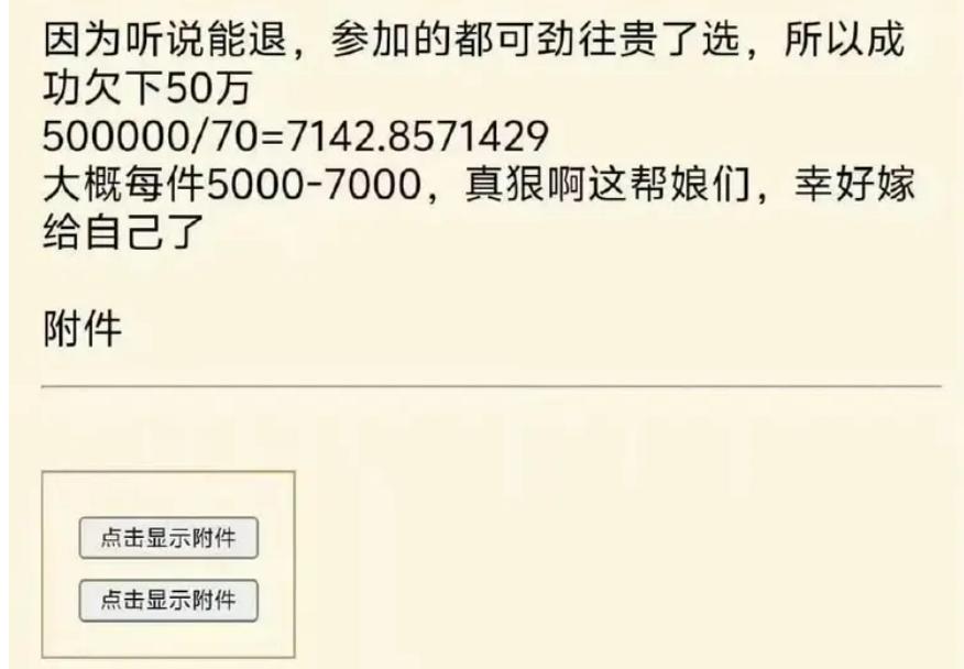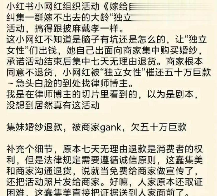 然而,盛宴落幕仅几天后,这场活动的组织者、一位小有名气的女博主,就在直播间里哭着说出了真相:“婚纱退不掉了,52万,全部要我一个人赔。”