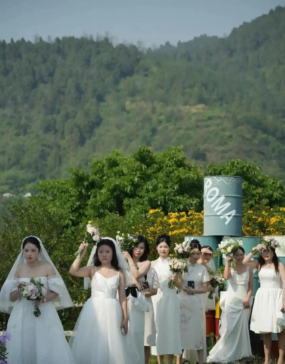 70多名女子统一换上雪白婚纱,化妆师团队从凌晨四点就开始忙碌。摄影师、航拍无人机、花瓣雨、誓言台——小禾几乎动用了所有资源,把这场活动办得像模像样。