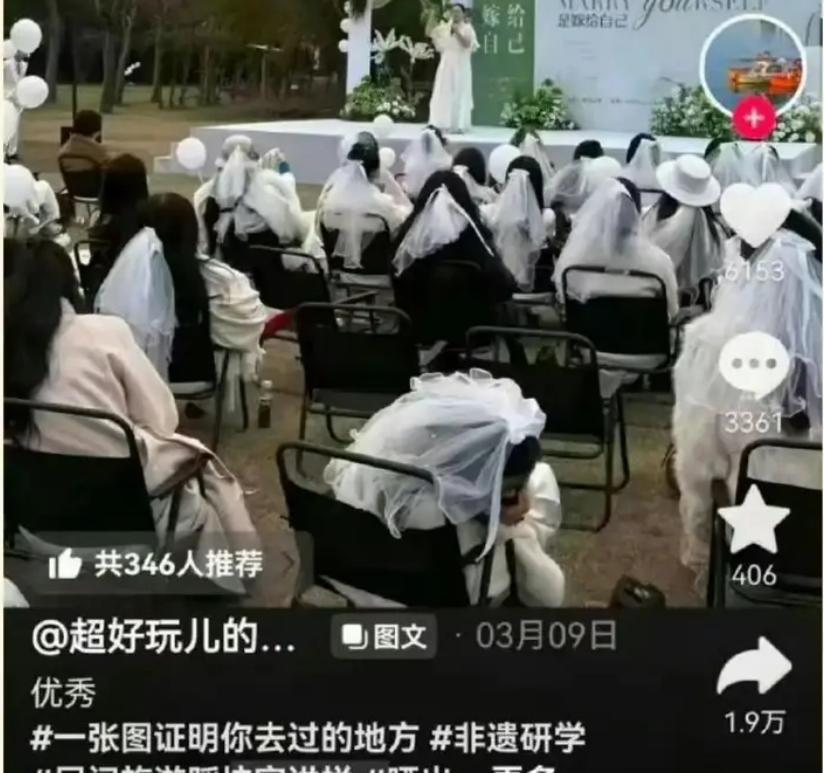 2026年3月下旬,大理洱海边的一场“嫁给自己”集体婚礼视频,曾一度刷屏社交平台。画面中,70多名身着洁白婚纱的女子手捧花束,对着苍山洱海宣誓“终身爱自己”。唯美的镜头、整齐的誓言、独立女性的标签——一切都像是一场精心策划的流量盛宴。