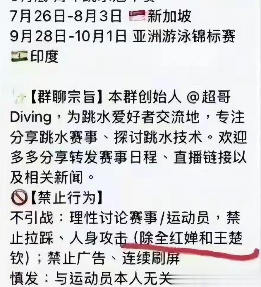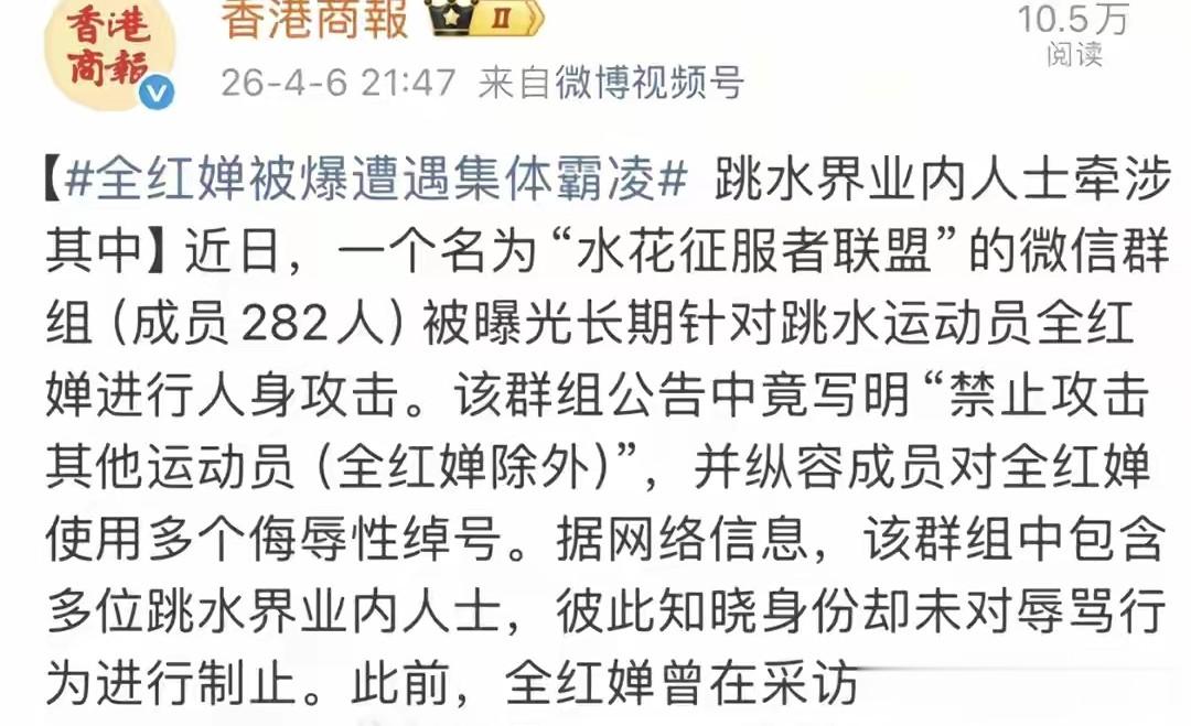 大家以为是零星骂战吗,不是这么简单,有报道盯到一个叫水花征服者联盟的微信群,建立在2022年,里头有282人,群里长期集中冲着全红婵骂,群公告还写着只准攻击她,不准骂别人,这种明目张胆,算不算组织化网暴,算不算有预谋的围殴。