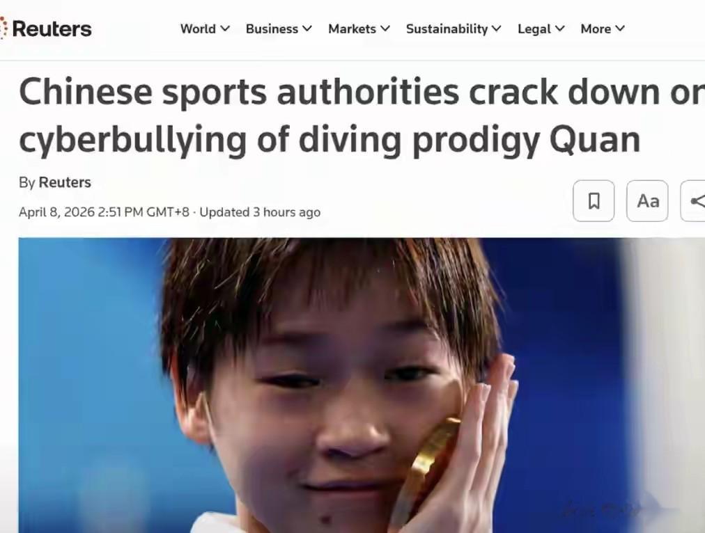 后来事情传到国外了,4月8日,路透社和法新社都报道了,一家说中国体育主管部门严查针对天才跳水少女的网暴,一家说中方宣布调查恶意网暴,这么一来,世界都在看,丢人的不是运动员,是那些在键盘后面扎针的人。