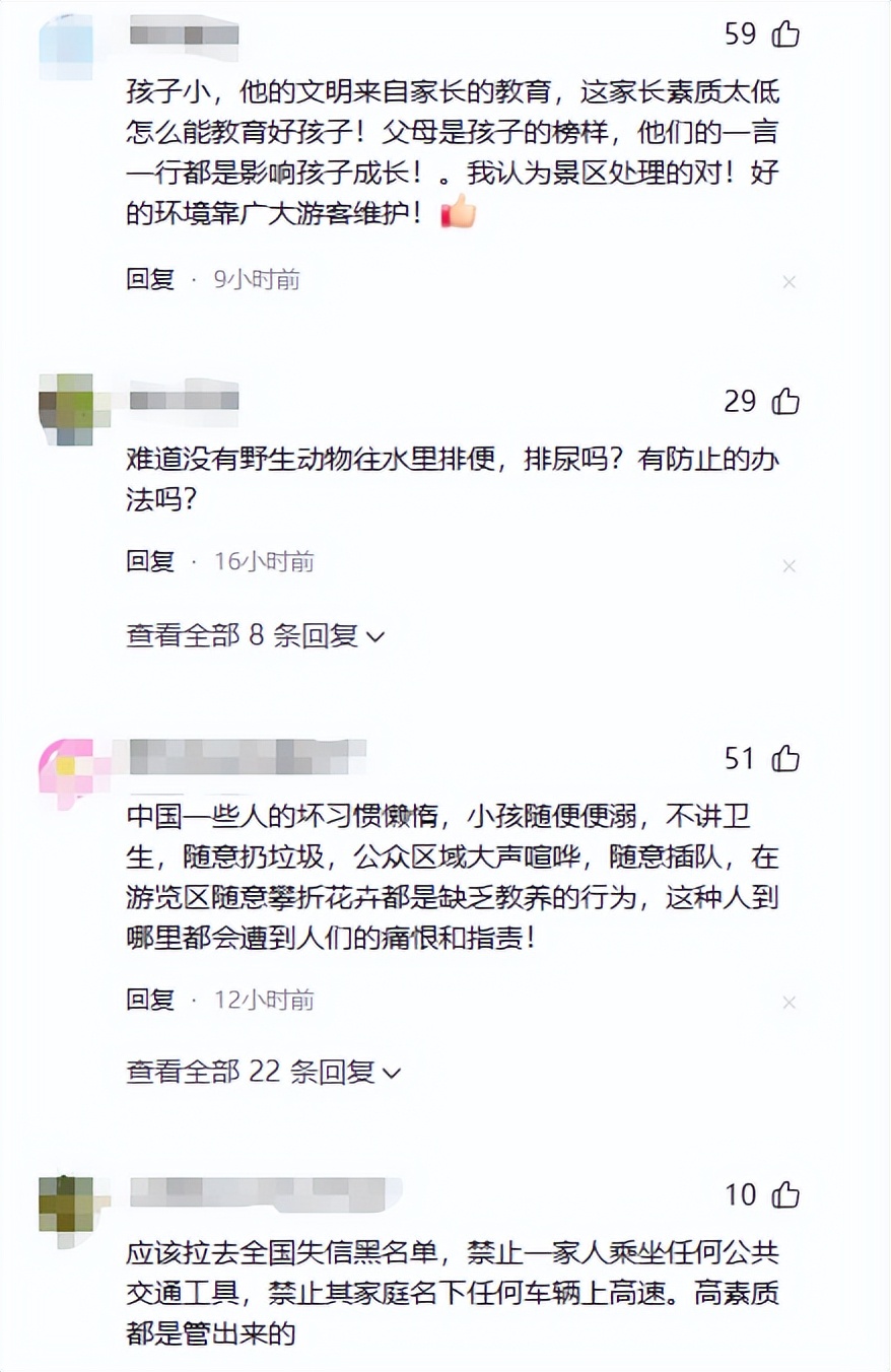 极目新闻 2026-4-6 游客目睹男童向景区钙化彩池中小便,男童母亲称“孩子不能憋尿,附近没有厕所”,景区回应:附近有厕所,已禁止该家庭“再次入园”