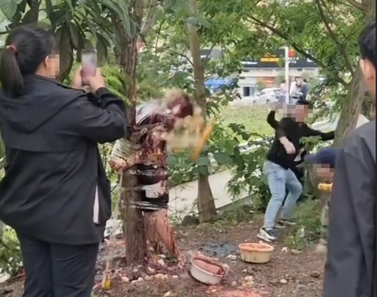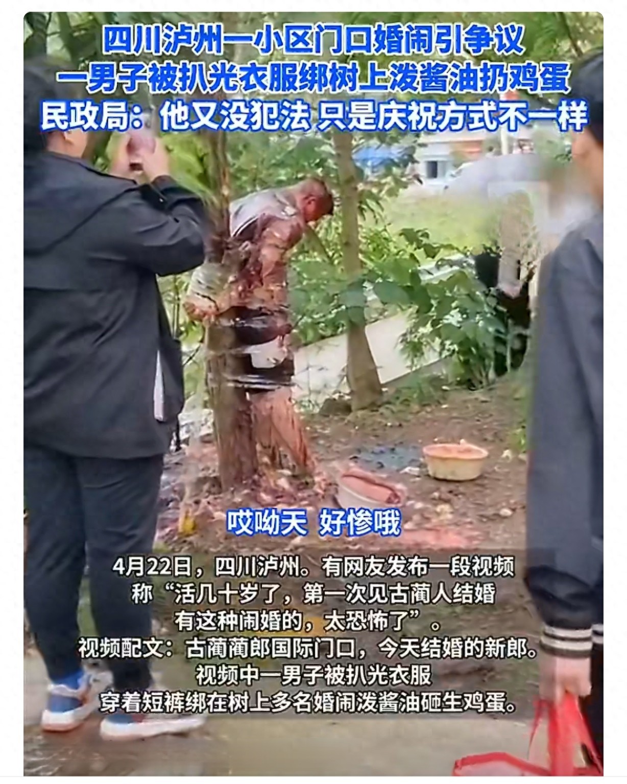 事情发生在4月22日,古蔺县蔺郎国际小区门口。视频里,一名新郎被扒光上衣,只剩短裤,被绳子绑在树上动弹不得。周围一群人嬉笑着,对着他泼酱油、扔生鸡蛋,浑身上下沾满了污渍,狼狈不堪。现场围观的人举着手机拍照录像,哄笑声不断,完全没人顾及新郎的难堪与痛苦。发布视频的网友直呼:“活了几十年,第一次见这种闹婚,太恐怖了!”