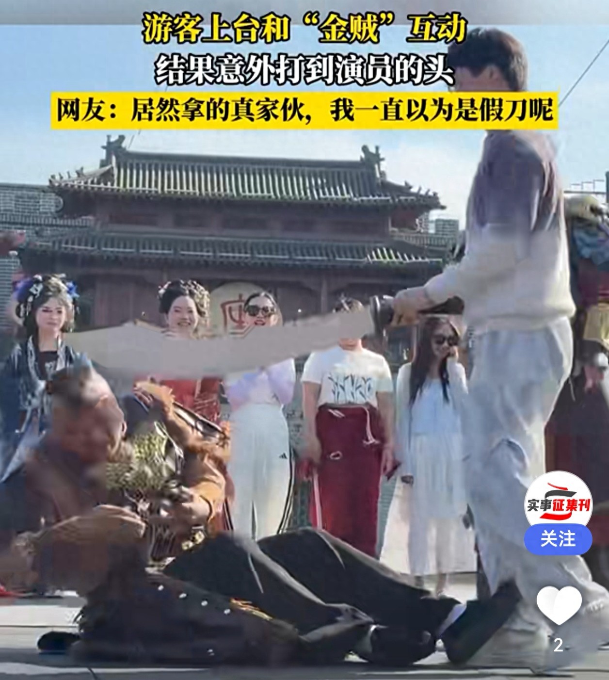 一名饰演“金将军”的演员在与游客互动过程中,游客手中的道具大刀突然滑落,砸中演员头部。现场一度引发围观与担忧。