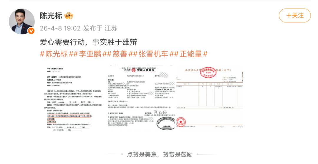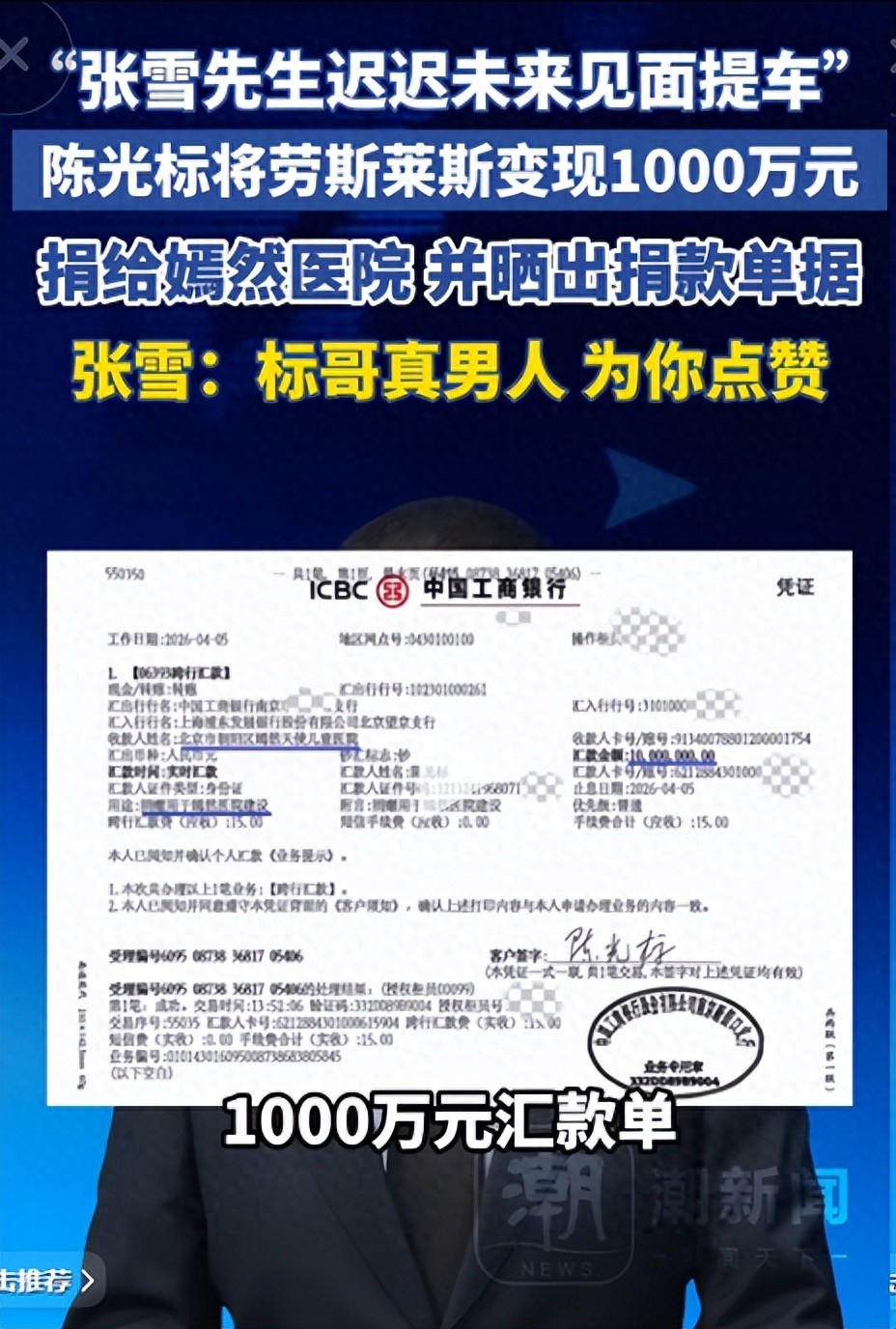 他没有多余的废话,直接在短视频平台晒出工商银行的转账凭证,收款方清清楚楚写着“北京嫣然天使儿童医院”,金额1000万,转账时间一目了然。