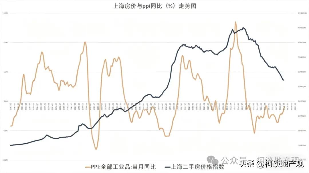完全可以看出,PPI涨跌和全国以及上海房价涨跌周期基本都是同步的。